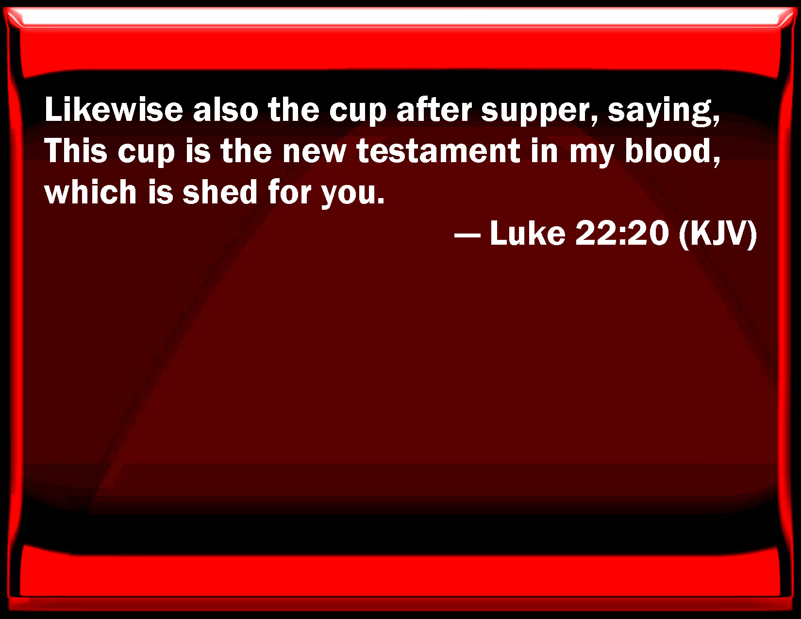 Bible Verse Slide Luke 22:20 Likewise also the cup after supper, saying, This cup is the new testament in my blood, which is shed for you. KJV: Likewise also the cup after supper, saying, This cup is the new testament in my blood, which is shed for you. DRB: In like manner the chalice also, after he had supped, saying: This is the chalice, the new testament in my blood, which shall be shed for you. DBT: In like manner also the cup, after having supped, saying, This cup is the new covenant in my blood, which is poured out for you. ERV: And the cup in like manner after supper, saying, This cup is the new covenant in my blood, even that which is poured out for you. WBT: Likewise also the cup after supper, saying, This cup is the new testament in my blood, which is shed for you. WEB: Likewise, he took the cup after supper, saying, "This cup is the new covenant in my blood, which is poured out for you. YLT: In like manner, also, the cup after the supping, saying, 'This cup is the new covenant in my blood, that for you is being poured forth.Links Luke 22:20 NIV • Luke 22:20 NLT • Luke 22:20 ESV • Luke 22:20 NASB • Luke 22:20 KJV • Luke 22:20 Interlinear • Luke 22:20 Commentaries • Luke 22:20 Parallel Texts • Luke 22:20 Bible Apps • Luke 22:20 Parallel • Bible Hub |