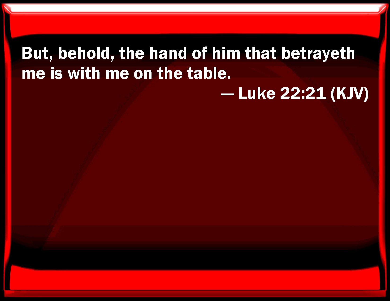 Bible Verse Slide Luke 22:21 But, behold, the hand of him that betrays me is with me on the table. KJV: But, behold, the hand of him that betrayeth me is with me on the table. DRB: But yet behold, the hand of him that betrayeth me is with me on the table. DBT: Moreover, behold, the hand of him that delivers me up is with me on the table; ERV: But behold, the hand of him that betrayeth me is with me on the table. WBT: But behold, the hand of him that betrayeth me is with me on the table. WEB: But behold, the hand of him who betrays me is with me on the table. YLT: But, lo, the hand of him delivering me up is with me on the table,Links Luke 22:21 NIV • Luke 22:21 NLT • Luke 22:21 ESV • Luke 22:21 NASB • Luke 22:21 KJV • Luke 22:21 Interlinear • Luke 22:21 Commentaries • Luke 22:21 Parallel Texts • Luke 22:21 Bible Apps • Luke 22:21 Parallel • Bible Hub |