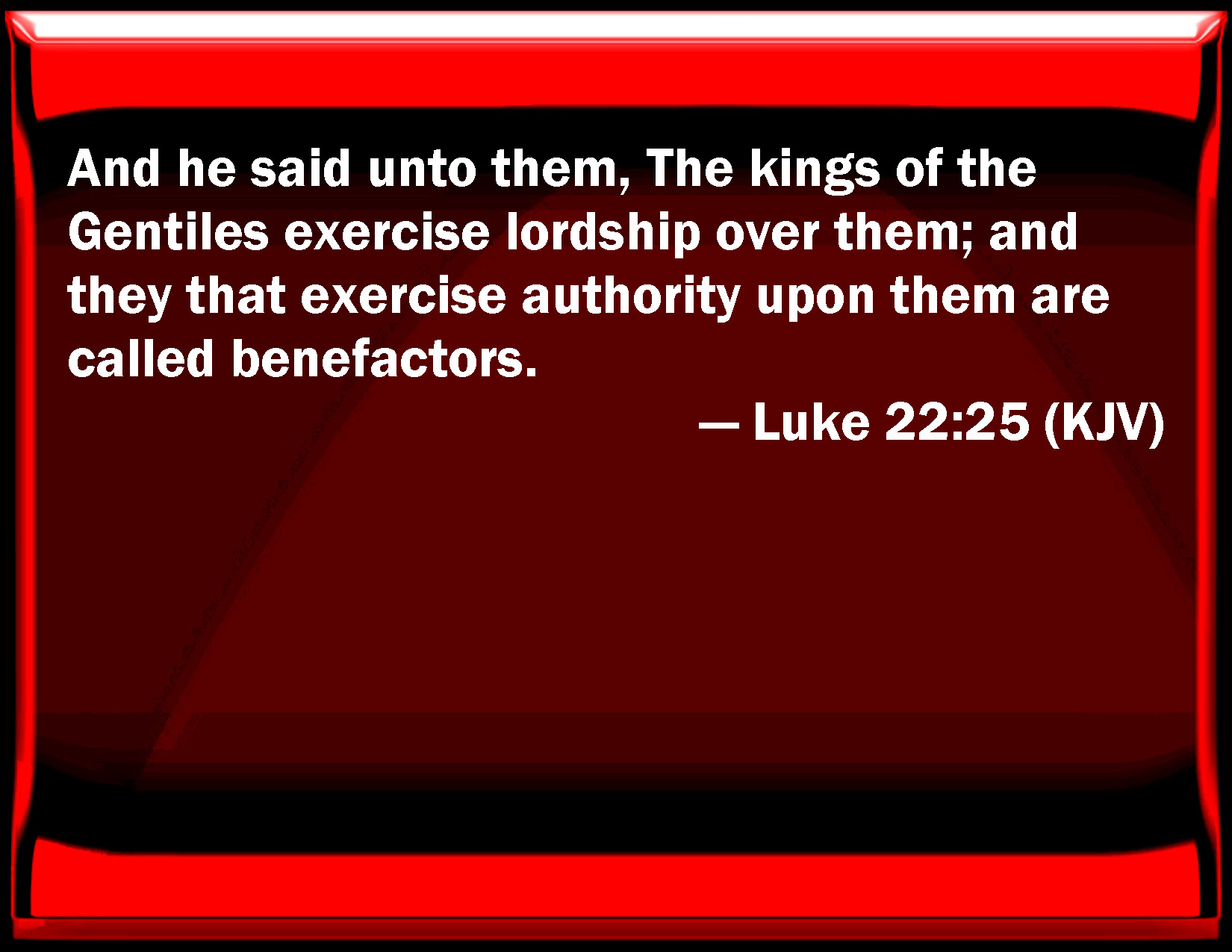 Bible Verse Slide Luke 22:25 And he said to them, The kings of the Gentiles exercise lordship over them; and they that exercise authority on them are called benefactors. KJV: And he said unto them, The kings of the Gentiles exercise lordship over them; and they that exercise authority upon them are called benefactors. DRB: And he said to them: The kings of the Gentiles lord it over them; and they that have power over them, are called beneficent. DBT: And he said to them, The kings of the nations rule over them, and they that exercise authority over them are called benefactors. ERV: And he said unto them, The kings of the Gentiles have lordship over them; and they that have authority over them are called Benefactors. WBT: And he said to them, The kings of the Gentiles exercise lordship over them; and they that exercise authority upon them, are called benefactors. WEB: He said to them, "The kings of the nations lord it over them, and those who have authority over them are called 'benefactors.' YLT: And he said to them, 'The kings of the nations do exercise lordship over them, and those exercising authority upon them are called benefactors;Links Luke 22:25 NIV • Luke 22:25 NLT • Luke 22:25 ESV • Luke 22:25 NASB • Luke 22:25 KJV • Luke 22:25 Interlinear • Luke 22:25 Commentaries • Luke 22:25 Parallel Texts • Luke 22:25 Bible Apps • Luke 22:25 Parallel • Bible Hub |
