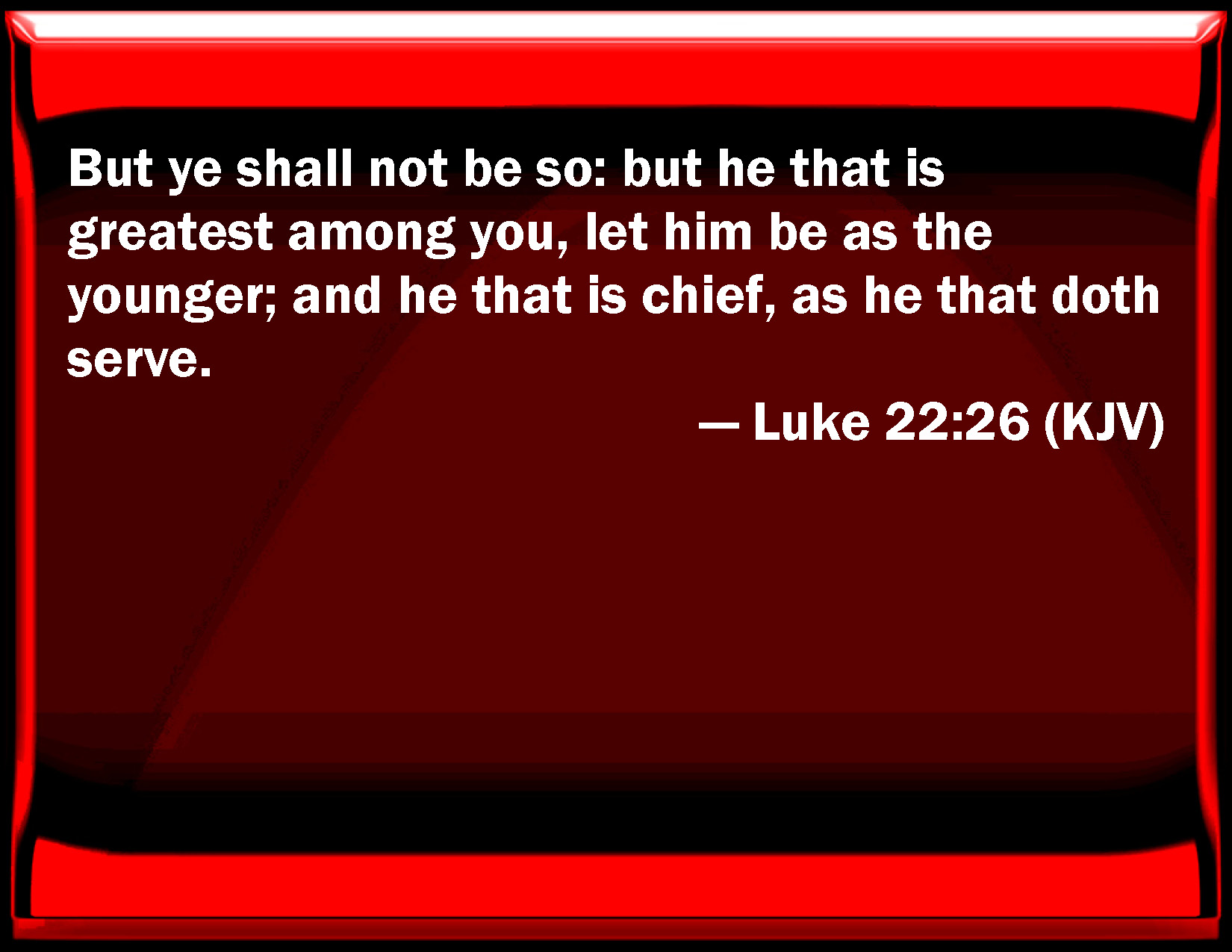 Bible Verse Slide Luke 22:26 But you shall not be so: but he that is greatest among you, let him be as the younger; and he that is chief, as he that does serve. KJV: But ye shall not be so: but he that is greatest among you, let him be as the younger; and he that is chief, as he that doth serve. DRB: But you not so: but he that is the greater among you, let him become as the younger; and he that is the leader, as he that serveth. DBT: But ye shall not be thus; but let the greater among you be as the younger, and the leader as he that serves. ERV: But ye shall not be so: but he that is the greater among you, let him become as the younger; and he that is chief, as he that doth serve. WBT: But ye shall not be so: but he that is greatest among you, let him be as the younger; and he that is chief, as he that doth serve. WEB: But not so with you. But one who is the greater among you, let him become as the younger, and one who is governing, as one who serves. YLT: but ye are not so, but he who is greater among you — let him be as the younger; and he who is leading, as he who is ministering;Links Luke 22:26 NIV • Luke 22:26 NLT • Luke 22:26 ESV • Luke 22:26 NASB • Luke 22:26 KJV • Luke 22:26 Interlinear • Luke 22:26 Commentaries • Luke 22:26 Parallel Texts • Luke 22:26 Bible Apps • Luke 22:26 Parallel • Bible Hub |