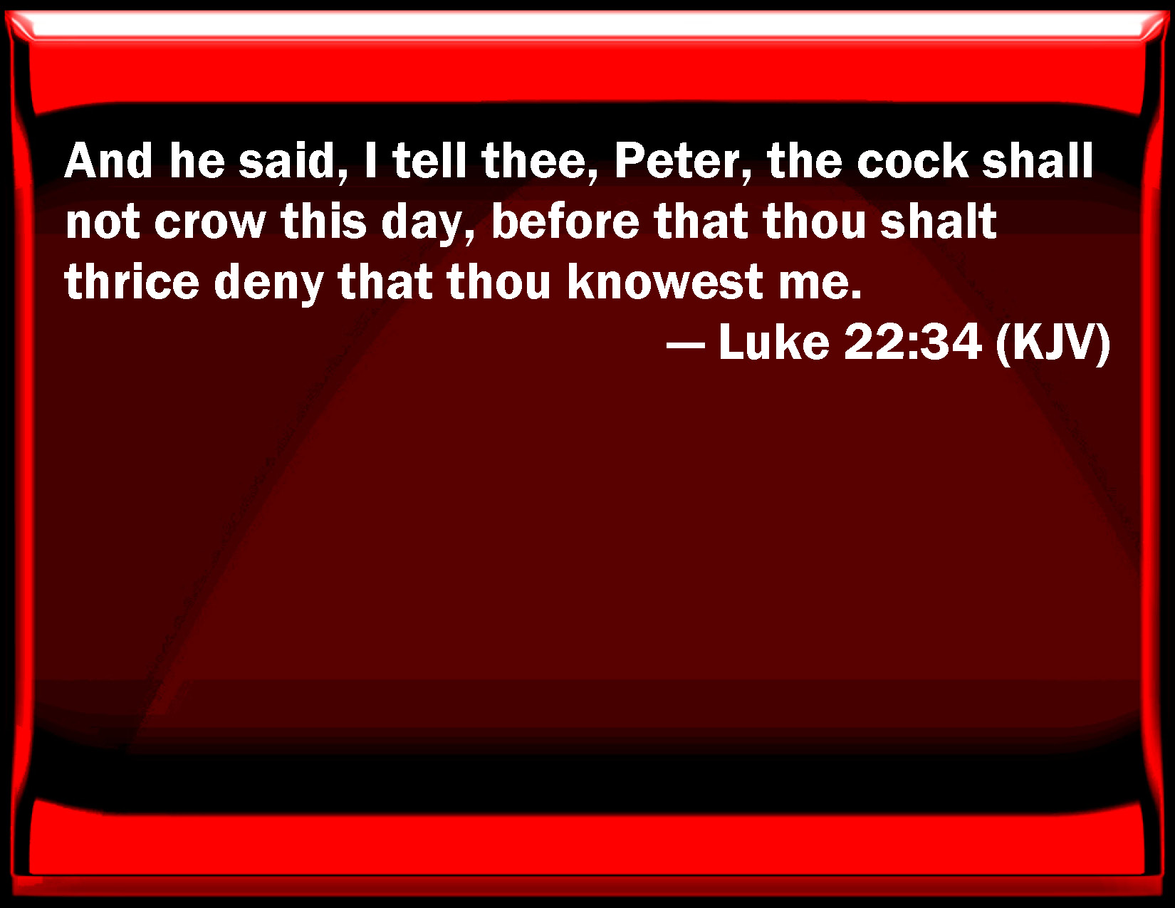 Bible Verse Slide Luke 22:34 And he said, I tell you, Peter, the cock shall not crow this day, before that you shall thrice deny that you know me. KJV: And he said, I tell thee, Peter, the cock shall not crow this day, before that thou shalt thrice deny that thou knowest me. DRB: And he said: I say to thee, Peter, the cock shall not crow this day, till thou thrice deniest that thou knowest me. And he said to them: DBT: And he said, I tell thee, Peter, the cock shall not crow to-day before that thou shalt thrice deny that thou knowest me. ERV: And he said, I tell thee, Peter, the cock shall not crow this day, until thou shalt thrice deny that thou knowest me. WBT: And he said, I tell thee, Peter, the cock will not crow this day, before thou wilt thrice deny that thou knowest me. WEB: He said, "I tell you, Peter, the rooster will by no means crow today until you deny that you know me three times." YLT: and he said, 'I say to thee, Peter, a cock shall not crow to-day, before thrice thou mayest disown knowing me.'Links Luke 22:34 NIV • Luke 22:34 NLT • Luke 22:34 ESV • Luke 22:34 NASB • Luke 22:34 KJV • Luke 22:34 Interlinear • Luke 22:34 Commentaries • Luke 22:34 Parallel Texts • Luke 22:34 Bible Apps • Luke 22:34 Parallel • Bible Hub |