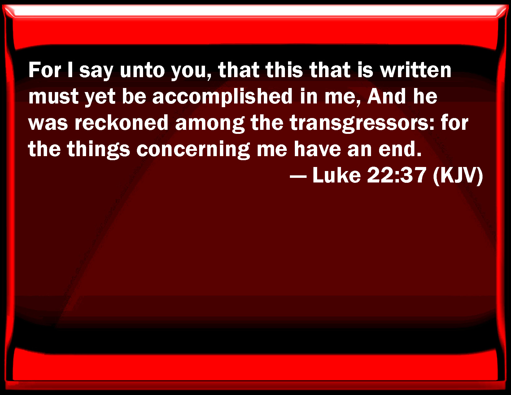 Bible Verse Slide Luke 22:37 For I say to you, that this that is written must yet be accomplished in me, And he was reckoned among the transgressors: for the things concerning me have an end. KJV: For I say unto you, that this that is written must yet be accomplished in me, And he was reckoned among the transgressors: for the things concerning me have an end. DRB: For I say to you, that this that is written must yet be fulfilled in me: And with the wicked was he reckoned. For the things concerning me have an end. DBT: for I say unto you, that this that is written must yet be accomplished in me, And he was reckoned with the lawless: for also the things concerning me have an end. ERV: For I say unto you, that this which is written must be fulfilled in me, And he was reckoned with transgressors: for that which concerneth me hath fulfillment. WBT: For I say to you, that this which is written must yet be accomplished in me, And he was reckoned among the transgressors: for the things concerning me have an end. WEB: For I tell you that this which is written must still be fulfilled in me: 'He was counted with transgressors.' For that which concerns me has an end." YLT: for I say to you, that yet this that hath been written it behoveth to be fulfilled in me: And with lawless ones he was reckoned, for also the things concerning me have an end.'Links Luke 22:37 NIV • Luke 22:37 NLT • Luke 22:37 ESV • Luke 22:37 NASB • Luke 22:37 KJV • Luke 22:37 Interlinear • Luke 22:37 Commentaries • Luke 22:37 Parallel Texts • Luke 22:37 Bible Apps • Luke 22:37 Parallel • Bible Hub |