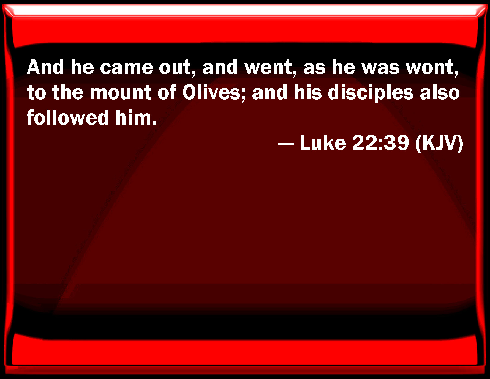 Bible Verse Slide Luke 22:39 And he came out, and went, as he was wont, to the mount of Olives; and his disciples also followed him. KJV: And he came out, and went, as he was wont, to the mount of Olives; and his disciples also followed him. DRB: And going out, he went, according to his custom, to the mount of Olives. And his disciples also followed him. DBT: And going forth he went according to his custom to the mount of Olives, and the disciples also followed him. ERV: And he came out, and went, as his custom was, unto the mount of Olives; and the disciples also followed him. WBT: And he came out, and went, as he was wont, to the mount of Olives; and his disciples also followed him. WEB: He came out, and went, as his custom was, to the Mount of Olives. His disciples also followed him. YLT: And having gone forth, he went on, according to custom, to the mount of the Olives, and his disciples also followed him,Links Luke 22:39 NIV • Luke 22:39 NLT • Luke 22:39 ESV • Luke 22:39 NASB • Luke 22:39 KJV • Luke 22:39 Interlinear • Luke 22:39 Commentaries • Luke 22:39 Parallel Texts • Luke 22:39 Bible Apps • Luke 22:39 Parallel • Bible Hub |
