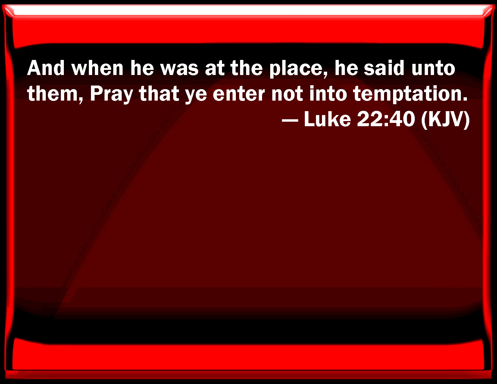 Bible Verse Slide Luke 22:40 And when he was at the place, he said to them, Pray that you enter not into temptation. KJV: And when he was at the place, he said unto them, Pray that ye enter not into temptation. DRB: And when he was come to the place, he said to them: Pray, lest ye enter into temptation. DBT: And when he was at the place he said to them, Pray that ye enter not into temptation. ERV: And when he was at the place, he said unto them, Pray that ye enter not into temptation. WBT: And when he was at the place, he said to them, Pray, that ye enter not into temptation. WEB: When he was at the place, he said to them, "Pray that you don't enter into temptation." YLT: and having come to the place, he said to them, 'Pray ye not to enter into temptation.'Links Luke 22:40 NIV • Luke 22:40 NLT • Luke 22:40 ESV • Luke 22:40 NASB • Luke 22:40 KJV • Luke 22:40 Interlinear • Luke 22:40 Commentaries • Luke 22:40 Parallel Texts • Luke 22:40 Bible Apps • Luke 22:40 Parallel • Bible Hub |