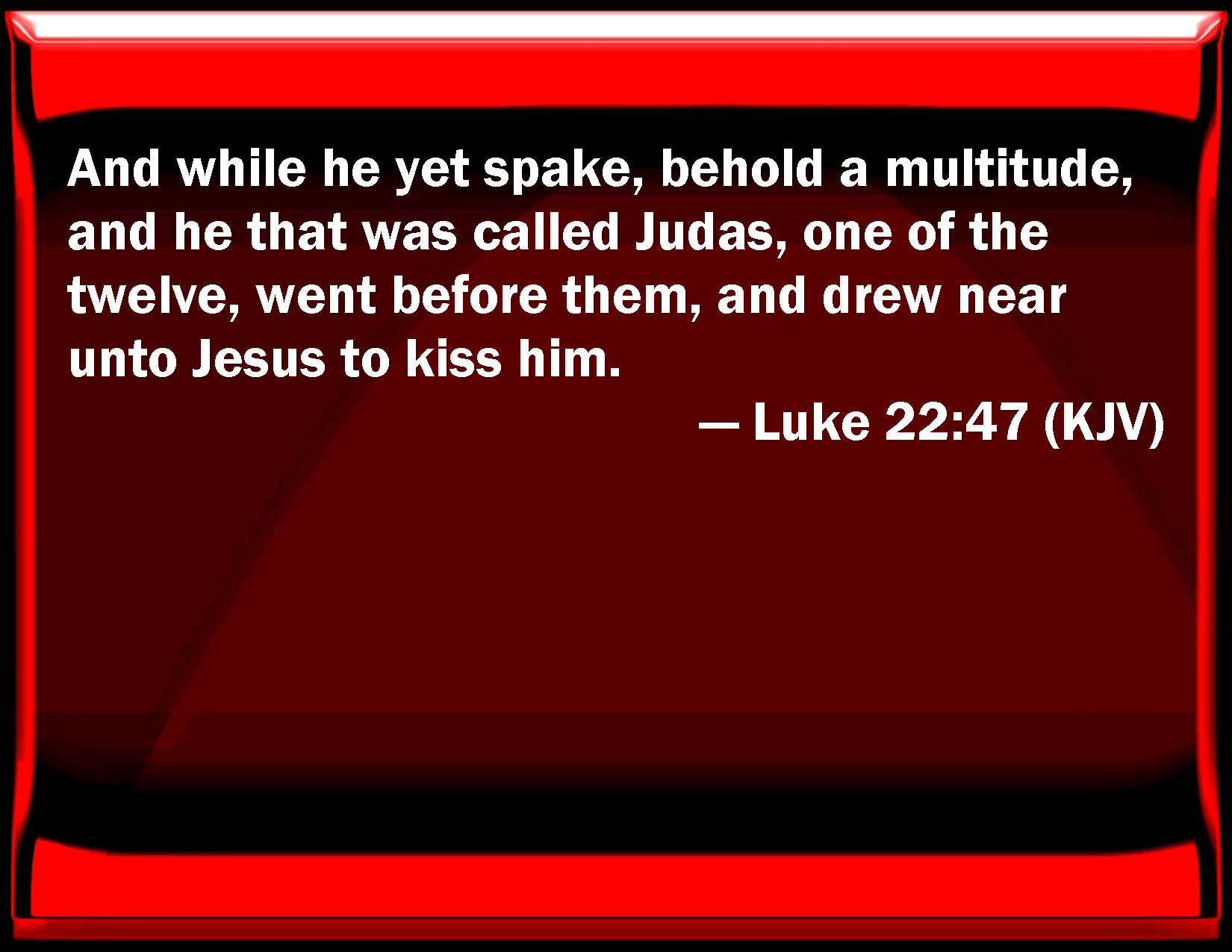 Bible Verse Slide Luke 22:47 And while he yet spoke, behold a multitude, and he that was called Judas, one of the twelve, went before them, and drew near to Jesus to kiss him. KJV: And while he yet spake, behold a multitude, and he that was called Judas, one of the twelve, went before them, and drew near unto Jesus to kiss him. DRB: As he was yet speaking, behold a multitude; and he that was called Judas, one of the twelve, went before them, and drew near to Jesus, for to kiss him. DBT: As he was yet speaking, behold, a crowd, and he that was called Judas, one of the twelve, went on before them, and drew near to Jesus to kiss him. ERV: While he yet spake, behold, a multitude, and he that was called Judas, one of the twelve, went before them; and he drew near unto Jesus to kiss him. WBT: And while he was yet speaking, behold a multitude, and he that was called Judas, one of the twelve, went before them, and drew near to Jesus to kiss him. WEB: While he was still speaking, behold, a multitude, and he who was called Judas, one of the twelve, was leading them. He came near to Jesus to kiss him. YLT: And while he is speaking, lo, a multitude, and he who is called Judas, one of the twelve, was coming before them, and he came nigh to Jesus to kiss him,Links Luke 22:47 NIV • Luke 22:47 NLT • Luke 22:47 ESV • Luke 22:47 NASB • Luke 22:47 KJV • Luke 22:47 Interlinear • Luke 22:47 Commentaries • Luke 22:47 Parallel Texts • Luke 22:47 Bible Apps • Luke 22:47 Parallel • Bible Hub |