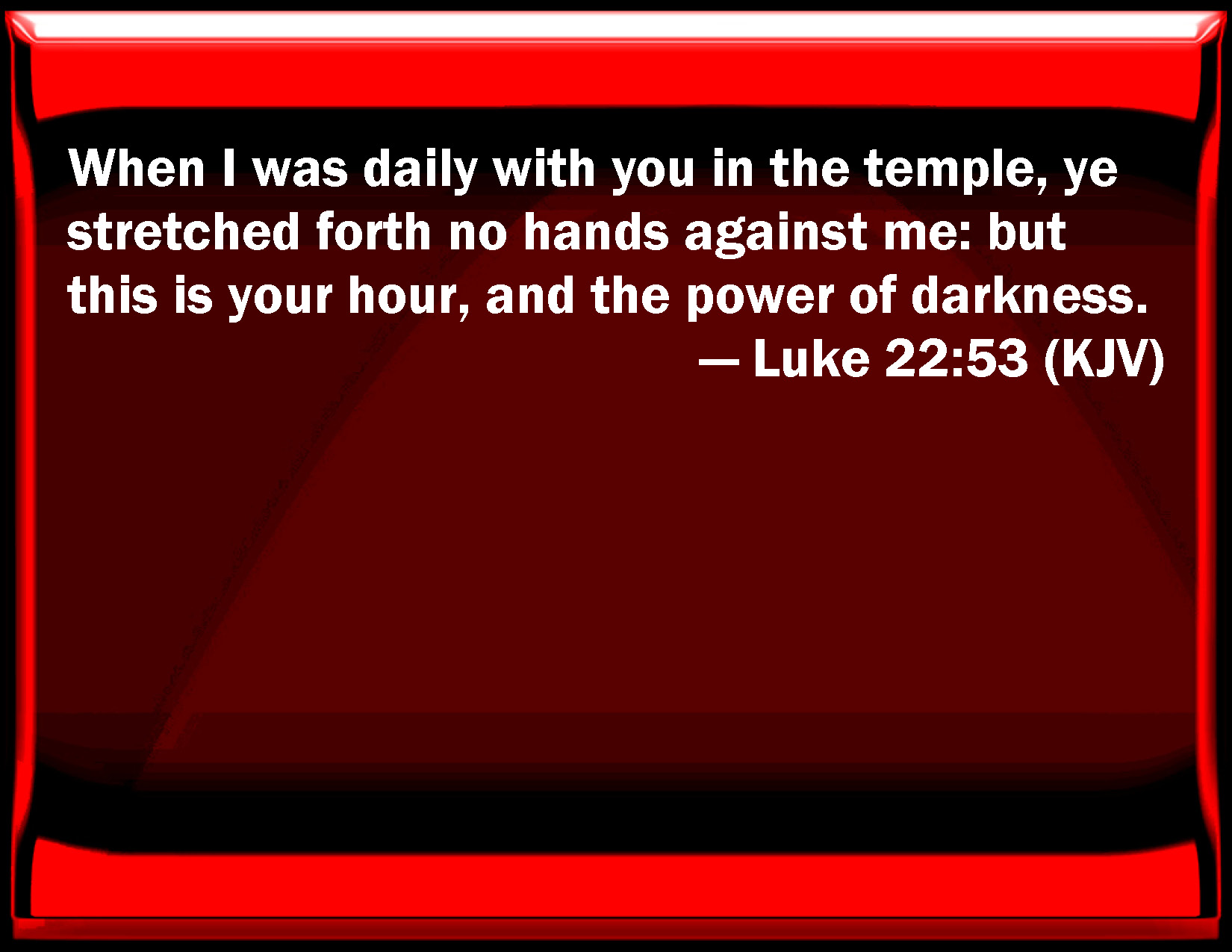 Bible Verse Slide Luke 22:53 When I was daily with you in the temple, you stretched forth no hands against me: but this is your hour, and the power of darkness. KJV: When I was daily with you in the temple, ye stretched forth no hands against me: but this is your hour, and the power of darkness. DRB: When I was daily with you in the temple, you did not stretch forth your hands against me: but this is your hour, and the power of darkness. DBT: When I was day by day with you in the temple ye did not stretch out your hands against me; but this is your hour and the power of darkness. ERV: When I was daily with you in the temple, ye stretched not forth your hands against me: but this is your hour, and the power of darkness. WBT: When I was daily with you in the temple, ye stretched forth no hands against me: but this is your hour, and the power of darkness. WEB: When I was with you in the temple daily, you didn't stretch out your hands against me. But this is your hour, and the power of darkness." YLT: while daily I was with you in the temple, ye did stretch forth no hands against me; but this is your hour and the power of the darkness.'Links Luke 22:53 NIV • Luke 22:53 NLT • Luke 22:53 ESV • Luke 22:53 NASB • Luke 22:53 KJV • Luke 22:53 Interlinear • Luke 22:53 Commentaries • Luke 22:53 Parallel Texts • Luke 22:53 Bible Apps • Luke 22:53 Parallel • Bible Hub |