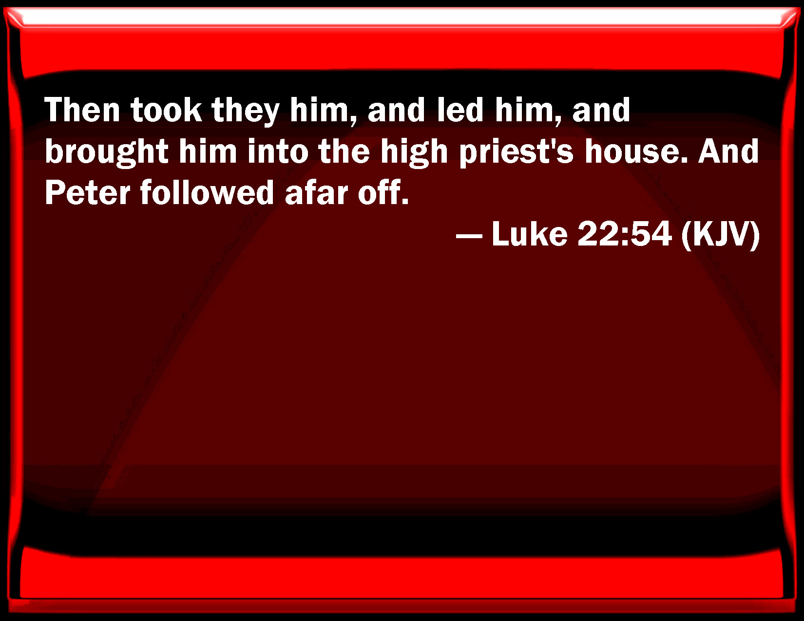 Bible Verse Slide Luke 22:54 Then took they him, and led him, and brought him into the high priest's house. And Peter followed afar off. KJV: Then took they him, and led him, and brought him into the high priest's house. And Peter followed afar off. DRB: And apprehending him, they led him to the high priest's house. But Peter followed afar off. DBT: And having laid hold on him, they led him away, and they led him into the house of the high priest. And Peter followed afar off. ERV: And they seized him, and led him away, and brought him into the high priest's house. But Peter followed afar off. WBT: Then they took him, and led him, and brought him into the high priest's house. And Peter followed at a distance. WEB: They seized him, and led him away, and brought him into the high priest's house. But Peter followed from a distance. YLT: And having taken him, they led and brought him to the house of the chief priest. And Peter was following afar off,Links Luke 22:54 NIV • Luke 22:54 NLT • Luke 22:54 ESV • Luke 22:54 NASB • Luke 22:54 KJV • Luke 22:54 Interlinear • Luke 22:54 Commentaries • Luke 22:54 Parallel Texts • Luke 22:54 Bible Apps • Luke 22:54 Parallel • Bible Hub |