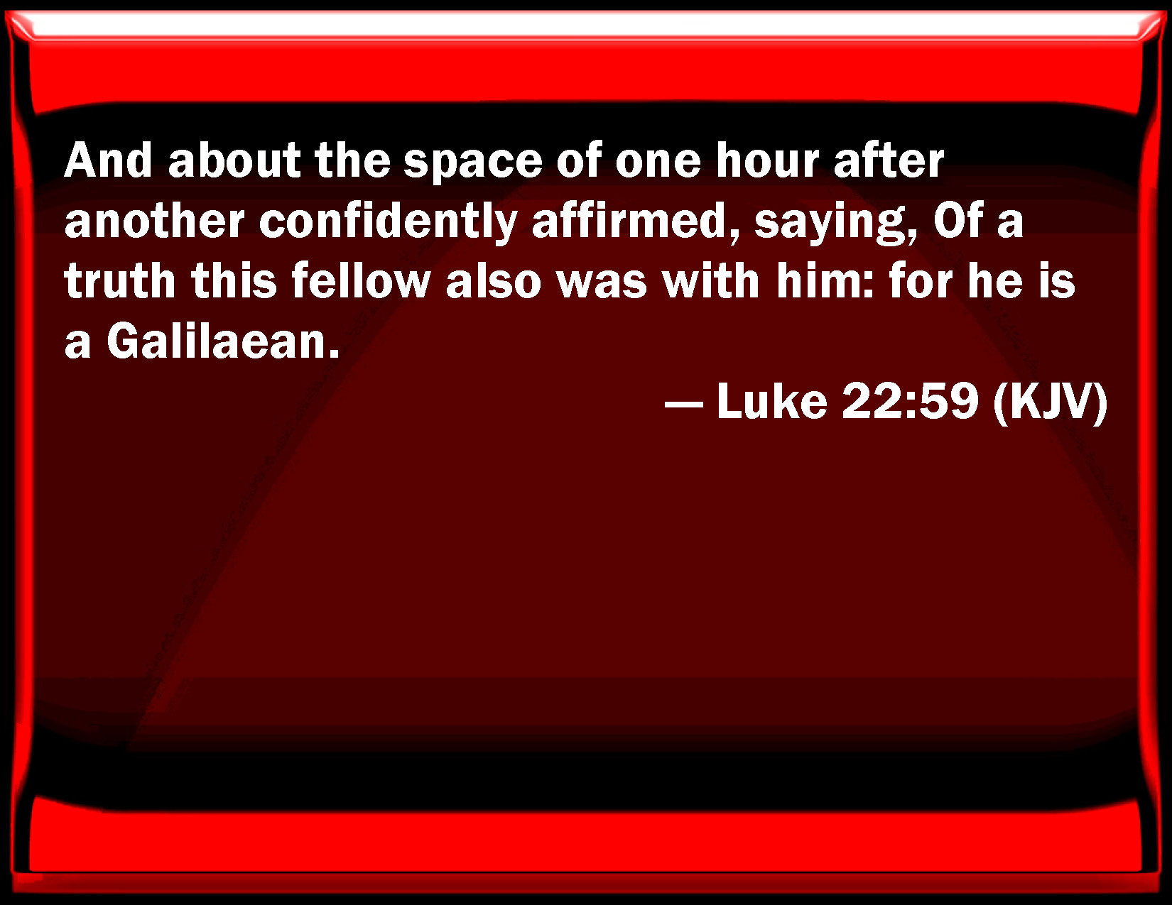 Bible Verse Slide Luke 22:59 And about the space of one hour after another confidently affirmed, saying, Of a truth this fellow also was with him: for he is a Galilaean. KJV: And about the space of one hour after another confidently affirmed, saying, Of a truth this fellow also was with him: for he is a Galilaean. DRB: And after the space, as it were of one hour, another certain man affirmed, saying: Of a truth, this man was also with him; for he is also a Galilean. DBT: And after the lapse of about one hour another stoutly maintained it, saying, In truth this man also was with him, for also he is a Galilaean. ERV: And after the space of about one hour another confidently affirmed, saying, Of a truth this man also was with him: for he is a Galilaean. WBT: And about the space of one hour after, another confidently affirmed, saying, In truth this man also was with him; for he is a Galilean. WEB: After about one hour passed, another confidently affirmed, saying, "Truly this man also was with him, for he is a Galilean!" YLT: And one hour, as it were, having intervened, a certain other was confidently affirming, saying, 'Of a truth this one also was with him, for he is also a Galilean;'Links Luke 22:59 NIV • Luke 22:59 NLT • Luke 22:59 ESV • Luke 22:59 NASB • Luke 22:59 KJV • Luke 22:59 Interlinear • Luke 22:59 Commentaries • Luke 22:59 Parallel Texts • Luke 22:59 Bible Apps • Luke 22:59 Parallel • Bible Hub |