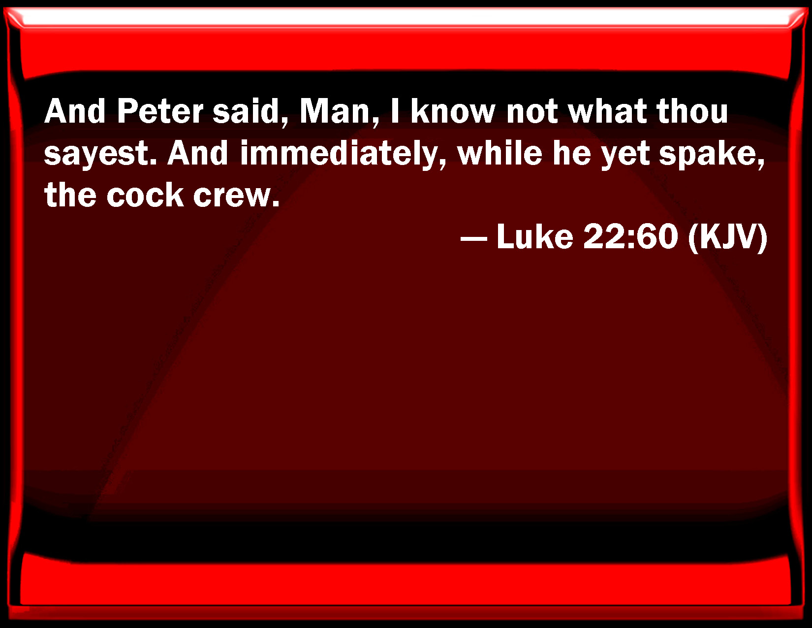Bible Verse Slide Luke 22:60 And Peter said, Man, I know not what you say. And immediately, while he yet spoke, the cock crew. KJV: And Peter said, Man, I know not what thou sayest. And immediately, while he yet spake, the cock crew. DRB: And Peter said: Man, I know not what thou sayest. And immediately, as he was yet speaking, the cock crew. DBT: And Peter said, Man, I know not what thou sayest. And immediately, while he was yet speaking, the cock crew. ERV: But Peter said, Man, I know not what thou sayest. And immediately, while he yet spake, the cock crew. WBT: And Peter said, Man, I know not what thou sayest. And immediately, while he was yet speaking, the cock crowed. WEB: But Peter said, "Man, I don't know what you are talking about!" Immediately, while he was still speaking, a rooster crowed. YLT: and Peter said, 'Man, I have not known what thou sayest;' and presently, while he is speaking, a cock crew.Links Luke 22:60 NIV • Luke 22:60 NLT • Luke 22:60 ESV • Luke 22:60 NASB • Luke 22:60 KJV • Luke 22:60 Interlinear • Luke 22:60 Commentaries • Luke 22:60 Parallel Texts • Luke 22:60 Bible Apps • Luke 22:60 Parallel • Bible Hub |