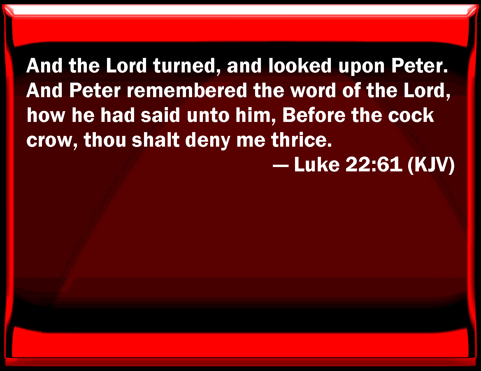 Bible Verse Slide Luke 22:61 And the Lord turned, and looked on Peter. And Peter remembered the word of the Lord, how he had said to him, Before the cock crow, you shall deny me thrice. KJV: And the Lord turned, and looked upon Peter. And Peter remembered the word of the Lord, how he had said unto him, Before the cock crow, thou shalt deny me thrice. DRB: And the Lord turning looked on Peter. And Peter remembered the word of the Lord, as he had said: Before the cock crow, thou shalt deny me thrice. DBT: And the Lord, turning round, looked at Peter; and Peter remembered the word of the Lord, how he said to him, Before the cock crow thou shalt deny me thrice. ERV: And the Lord turned, and looked upon Peter. And Peter remembered the word of the Lord, how that he said unto him, Before the cock crow this day, thou shalt deny me thrice. WBT: And the Lord turned, and looked upon Peter. And Peter remembered the word of the Lord, how he had said to him, Before the cock shall crow, thou wilt deny me thrice. WEB: The Lord turned, and looked at Peter. Then Peter remembered the Lord's word, how he said to him, "Before the rooster crows you will deny me three times." YLT: And the Lord having turned did look on Peter, and Peter remembered the word of the Lord, how he said to him — 'Before a cock shall crow, thou mayest disown me thrice;'Links Luke 22:61 NIV • Luke 22:61 NLT • Luke 22:61 ESV • Luke 22:61 NASB • Luke 22:61 KJV • Luke 22:61 Interlinear • Luke 22:61 Commentaries • Luke 22:61 Parallel Texts • Luke 22:61 Bible Apps • Luke 22:61 Parallel • Bible Hub |