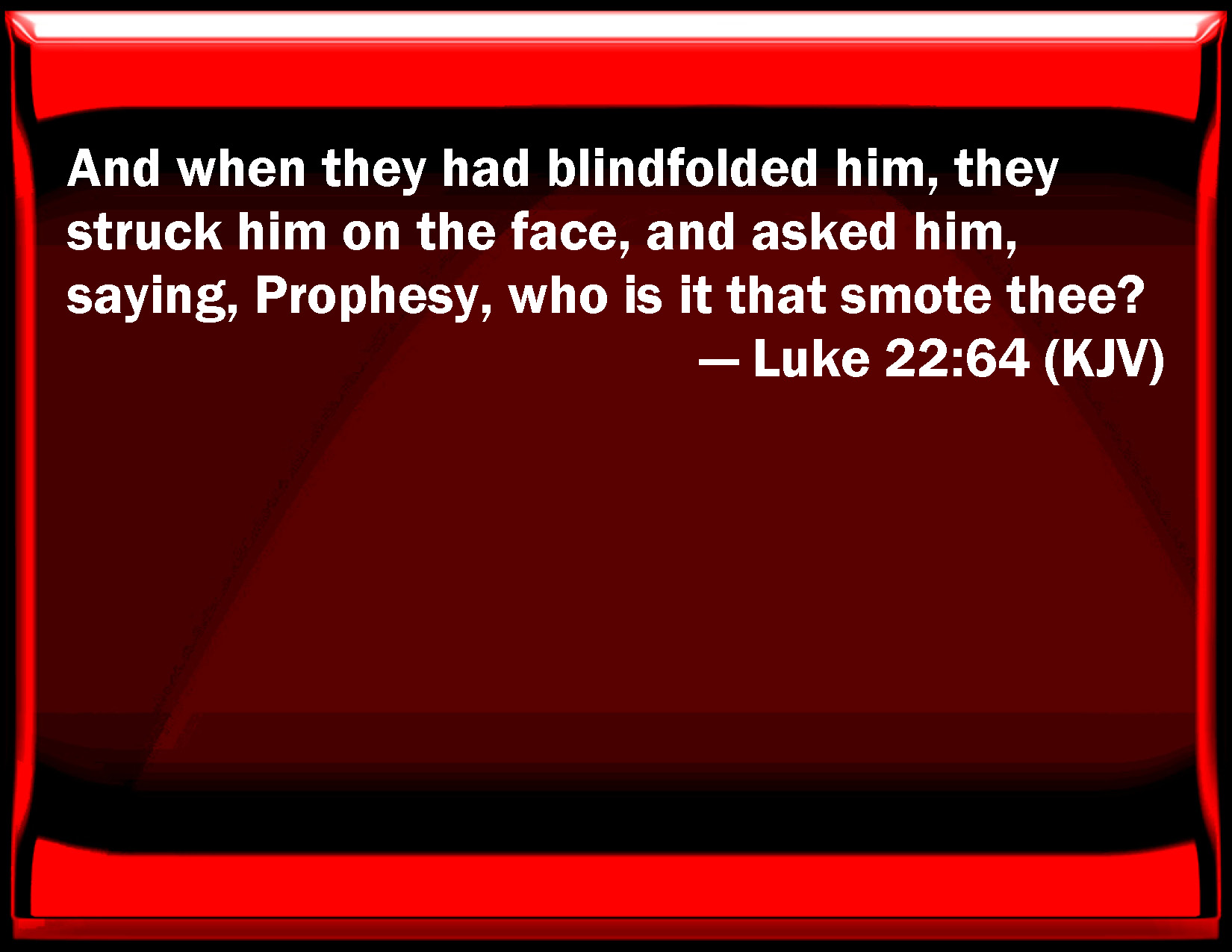 Bible Verse Slide Luke 22:64 And when they had blindfolded him, they struck him on the face, and asked him, saying, Prophesy, who is it that smote you? KJV: And when they had blindfolded him, they struck him on the face, and asked him, saying, Prophesy, who is it that smote thee? DRB: And they blindfolded him, and smote his face. And they asked him, saying: Prophesy, who is it that struck thee? DBT: and covering him up, asked him saying, Prophesy, who is it that struck thee? ERV: And they blindfolded him, and asked him, saying, Prophesy: who is he that struck thee? WBT: And when they had blindfolded him, they struck him on the face, and asked him, saying, Prophesy, who is it that smote thee? WEB: Having blindfolded him, they struck him on the face and asked him, "Prophesy! Who is the one who struck you?" YLT: and having blindfolded him, they were striking him on the face, and were questioning him, saying, 'Prophesy who he is who smote thee?'Links Luke 22:64 NIV • Luke 22:64 NLT • Luke 22:64 ESV • Luke 22:64 NASB • Luke 22:64 KJV • Luke 22:64 Interlinear • Luke 22:64 Commentaries • Luke 22:64 Parallel Texts • Luke 22:64 Bible Apps • Luke 22:64 Parallel • Bible Hub |