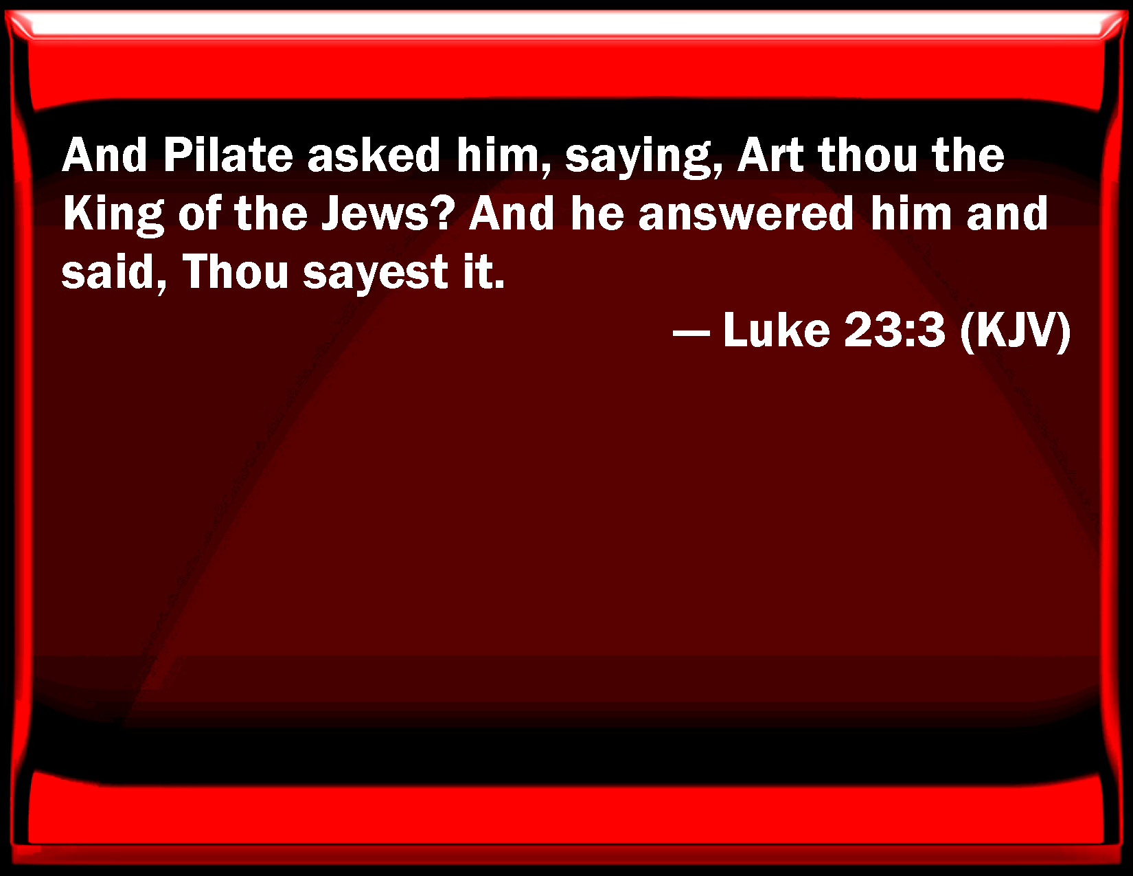 Bible Verse Slide Luke 23:3 And Pilate asked him, saying, Are you the King of the Jews? And he answered him and said, You say it. KJV: And Pilate asked him, saying, Art thou the King of the Jews? And he answered him and said, Thou sayest it. DRB: And Pilate asked him, saying: Art thou the king of the Jews? But he answering, said: Thou sayest it. DBT: And Pilate demanded of him saying, Art thou the king of the Jews? And he answering him said, Thou sayest. ERV: And Pilate asked him, saying, Art thou the King of the Jews? And he answered him and said, Thou sayest. WBT: And Pilate asked him, saying, Art thou the King of the Jews? And he answered him and said, Thou sayest it. WEB: Pilate asked him, "Are you the King of the Jews?" He answered him, "So you say." YLT: And Pilate questioned him, saying, 'Thou art the king of the Jews?' and he answering him, said, 'Thou dost say it.'Links Luke 23:3 NIV • Luke 23:3 NLT • Luke 23:3 ESV • Luke 23:3 NASB • Luke 23:3 KJV • Luke 23:3 Interlinear • Luke 23:3 Commentaries • Luke 23:3 Parallel Texts • Luke 23:3 Bible Apps • Luke 23:3 Parallel • Bible Hub |