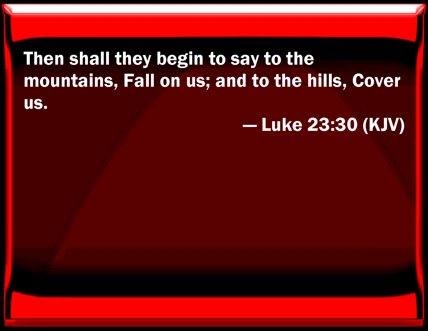 Bible Verse Slide Luke 23:30 Then shall they begin to say to the mountains, Fall on us; and to the hills, Cover us. KJV: Then shall they begin to say to the mountains, Fall on us; and to the hills, Cover us. DRB: Then shall they begin to say to the mountains: Fall upon us; and to the hills: Cover us. DBT: Then shall they begin to say to the mountains, Fall upon us; and to the hills, Cover us: ERV: Then shall they begin to say to the mountains, Fall on us; and to the hills, Cover us. WBT: Then shall they begin to say to the mountains, Fall on us; and to the hills, Cover us. WEB: Then they will begin to tell the mountains, 'Fall on us!' and tell the hills, 'Cover us.' YLT: then they shall begin to say to the mountains, Fall on us, and to the hills, Cover us; — Links Luke 23:30 NIV • Luke 23:30 NLT • Luke 23:30 ESV • Luke 23:30 NASB • Luke 23:30 KJV • Luke 23:30 Interlinear • Luke 23:30 Commentaries • Luke 23:30 Parallel Texts • Luke 23:30 Bible Apps • Luke 23:30 Parallel • Bible Hub |