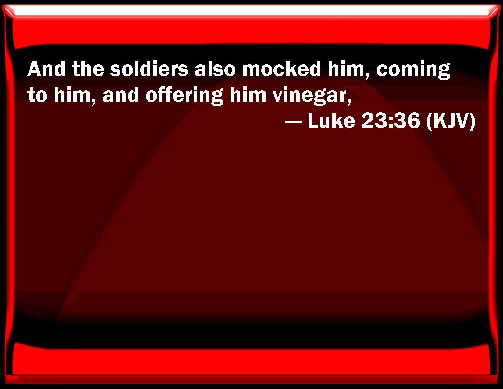 Bible Verse Slide Luke 23:36 And the soldiers also mocked him, coming to him, and offering him vinegar, KJV: And the soldiers also mocked him, coming to him, and offering him vinegar, DRB: And the soldiers also mocked him, coming to him, and offering him vinegar, DBT: And the soldiers also made game of him, coming up offering him vinegar, ERV: And the soldiers also mocked him, coming to him, offering him vinegar, WBT: And the soldiers also mocked him, coming to him, and offering him vinegar, WEB: The soldiers also mocked him, coming to him and offering him vinegar, YLT: And mocking him also were the soldiers, coming near and offering vinegar to him,Links Luke 23:36 NIV • Luke 23:36 NLT • Luke 23:36 ESV • Luke 23:36 NASB • Luke 23:36 KJV • Luke 23:36 Interlinear • Luke 23:36 Commentaries • Luke 23:36 Parallel Texts • Luke 23:36 Bible Apps • Luke 23:36 Parallel • Bible Hub |