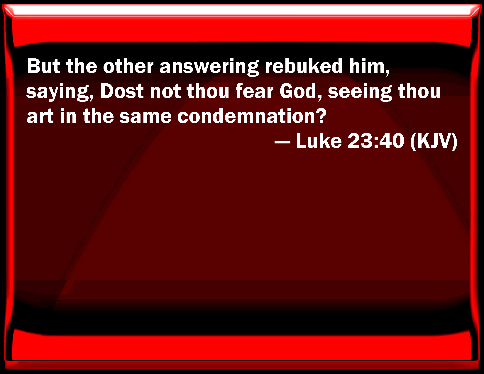 Bible Verse Slide Luke 23:40 But the other answering rebuked him, saying, Do not you fear God, seeing you are in the same condemnation? KJV: But the other answering rebuked him, saying, Dost not thou fear God, seeing thou art in the same condemnation? DRB: But the other answering, rebuked him, saying: Neither dost thou fear God, seeing thou art condemned under the same condemnation? DBT: But the other answering rebuked him, saying, Dost thou too not fear God, thou that art under the same judgment? ERV: But the other answered, and rebuking him said, Dost thou not even fear God, seeing thou art in the same condemnation? WBT: But the other answering, rebuked him, saying, Dost not thou fear God, seeing thou art in the same condemnation? WEB: But the other answered, and rebuking him said, "Don't you even fear God, seeing you are under the same condemnation? YLT: And the other answering, was rebuking him, saying, 'Dost thou not even fear God, that thou art in the same judgment?Links Luke 23:40 NIV • Luke 23:40 NLT • Luke 23:40 ESV • Luke 23:40 NASB • Luke 23:40 KJV • Luke 23:40 Interlinear • Luke 23:40 Commentaries • Luke 23:40 Parallel Texts • Luke 23:40 Bible Apps • Luke 23:40 Parallel • Bible Hub |