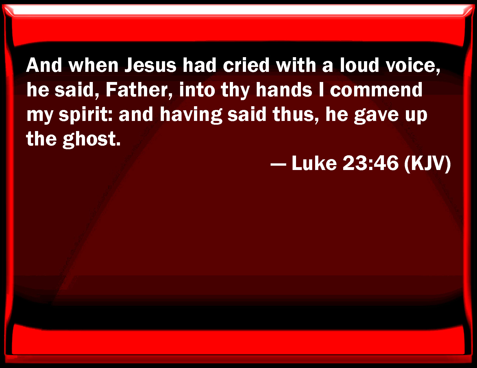 Bible Verse Slide Luke 23:46 And when Jesus had cried with a loud voice, he said, Father, into your hands I commend my spirit: and having said thus, he gave up the ghost. KJV: And when Jesus had cried with a loud voice, he said, Father, into thy hands I commend my spirit: and having said thus, he gave up the ghost. DRB: And Jesus crying out with a loud voice, said: Father, into thy hands I commend my spirit. And saying this, he gave up the ghost. DBT: And Jesus, having cried with a loud voice, said, Father, into thy hands I commit my spirit. And having said this, he expired. ERV: And when Jesus had cried with a loud voice, he said, Father, into thy hands I commend my spirit: and having said this, he gave up the ghost. WBT: And when Jesus had cried with a loud voice, he said, Father, into thy hands I commend my spirit: and having said thus, he expired. WEB: Jesus, crying with a loud voice, said, "Father, into your hands I commit my spirit!" Having said this, he breathed his last. YLT: and having cried with a loud voice, Jesus said, 'Father, to Thy hands I commit my spirit;' and these things having said, he breathed forth the spirit.Links Luke 23:46 NIV • Luke 23:46 NLT • Luke 23:46 ESV • Luke 23:46 NASB • Luke 23:46 KJV • Luke 23:46 Interlinear • Luke 23:46 Commentaries • Luke 23:46 Parallel Texts • Luke 23:46 Bible Apps • Luke 23:46 Parallel • Bible Hub |