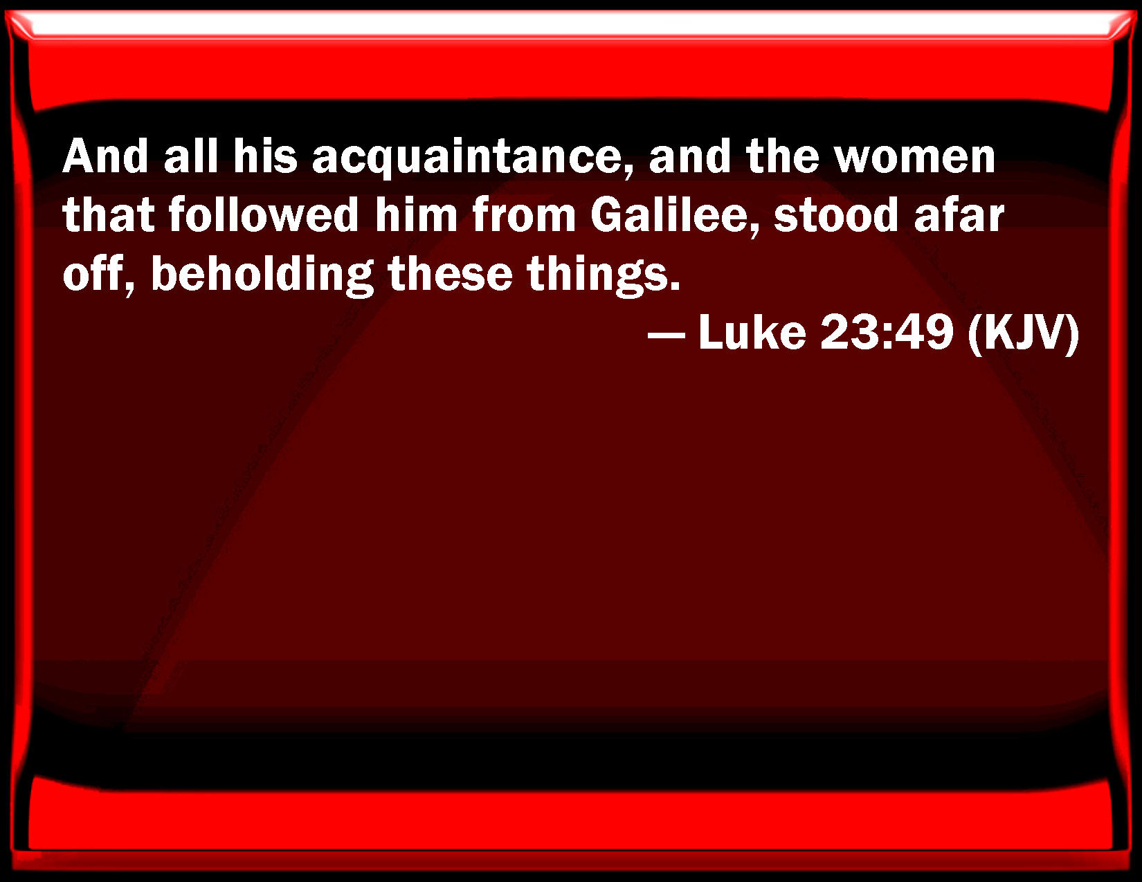 Bible Verse Slide Luke 23:49 And all his acquaintance, and the women that followed him from Galilee, stood afar off, beholding these things. KJV: And all his acquaintance, and the women that followed him from Galilee, stood afar off, beholding these things. DRB: And all his acquaintance, and the women that had followed him from Galilee, stood afar off, beholding these things. DBT: And all those who knew him stood afar off, the women also who had followed him from Galilee, beholding these things. ERV: And all his acquaintance, and the women that followed with him from Galilee, stood afar off, seeing these things. WBT: And all his acquaintance, and the women that followed him from Galilee, stood afar off beholding these things. WEB: All his acquaintances, and the women who followed with him from Galilee, stood at a distance, watching these things. YLT: and all his acquaintances stood afar off, and women who did follow him from Galilee, beholding these things.Links Luke 23:49 NIV • Luke 23:49 NLT • Luke 23:49 ESV • Luke 23:49 NASB • Luke 23:49 KJV • Luke 23:49 Interlinear • Luke 23:49 Commentaries • Luke 23:49 Parallel Texts • Luke 23:49 Bible Apps • Luke 23:49 Parallel • Bible Hub |