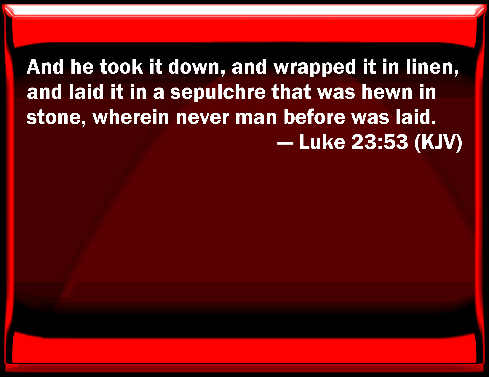 Bible Verse Slide Luke 23:53 And he took it down, and wrapped it in linen, and laid it in a sepulcher that was hewn in stone, wherein never man before was laid. KJV: And he took it down, and wrapped it in linen, and laid it in a sepulchre that was hewn in stone, wherein never man before was laid. DRB: And taking him down, he wrapped him in fine linen, and laid him in a sepulchre that was hewed in stone, wherein never yet any man had been laid. DBT: and having taken it down, wrapped it in fine linen and placed him in a tomb hewn in the rock, where no one had ever been laid. ERV: And he took it down, and wrapped it in a linen cloth, and laid him in a tomb that was hewn in stone, where never man had yet lain. WBT: And he took it down, and wrapped it in linen, and laid it in a sepulcher that was hewn in stone, in which man was never before laid. WEB: He took it down, and wrapped it in a linen cloth, and laid him in a tomb that was cut in stone, where no one had ever been laid. YLT: and having taken it down, he wrapped it in fine linen, and placed it in a tomb hewn out, where no one was yet laid.Links Luke 23:53 NIV • Luke 23:53 NLT • Luke 23:53 ESV • Luke 23:53 NASB • Luke 23:53 KJV • Luke 23:53 Interlinear • Luke 23:53 Commentaries • Luke 23:53 Parallel Texts • Luke 23:53 Bible Apps • Luke 23:53 Parallel • Bible Hub |