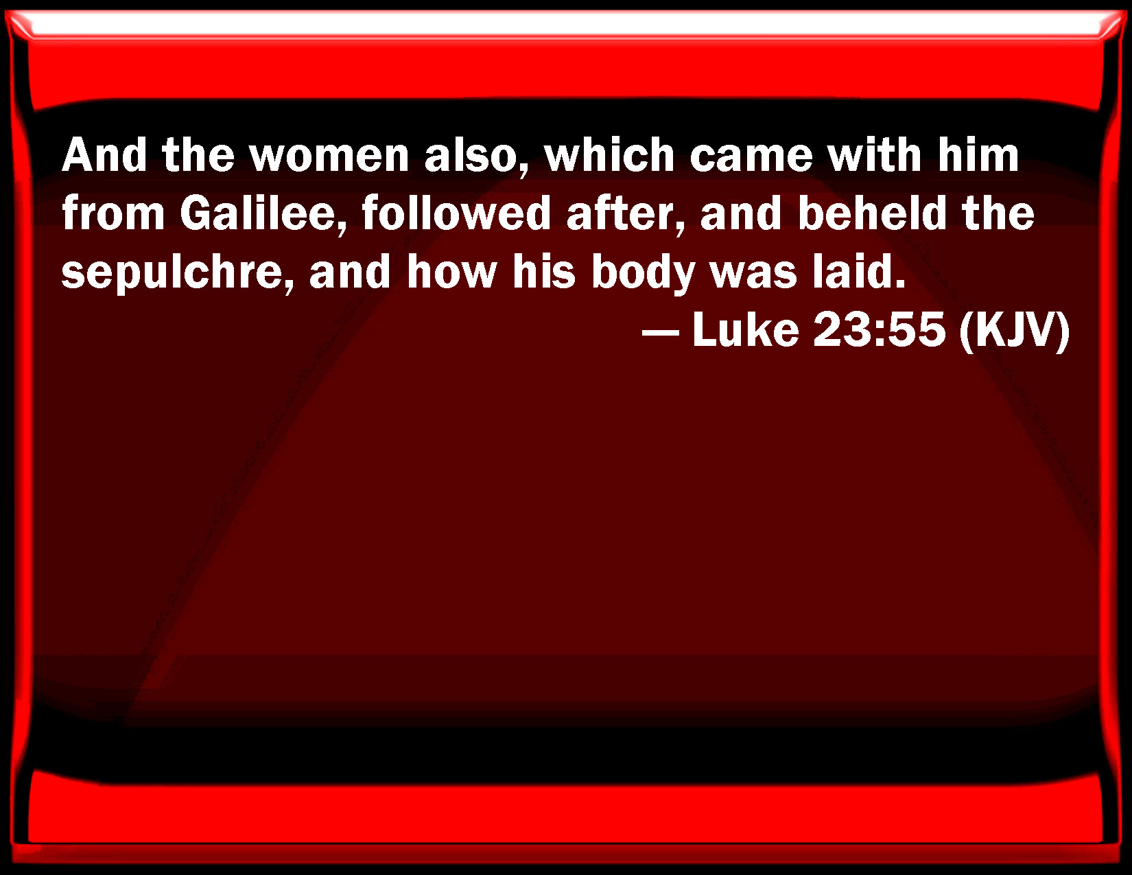 Bible Verse Slide Luke 23:55 And the women also, which came with him from Galilee, followed after, and beheld the sepulcher, and how his body was laid. KJV: And the women also, which came with him from Galilee, followed after, and beheld the sepulchre, and how his body was laid. DRB: And the women that were come with him from Galilee, following after, saw the sepulchre, and how his body was laid. DBT: And women, who had come along with him out of Galilee, having followed, saw the sepulchre and how his body was placed. ERV: And the women, which had come with him out of Galilee, followed after, and beheld the tomb, and how his body was laid. WBT: And the women also, who came with him from Galilee, followed after, and beheld the sepulcher, and how his body was laid. WEB: The women, who had come with him out of Galilee, followed after, and saw the tomb, and how his body was laid. YLT: and the women also who have come with him out of Galilee having followed after, beheld the tomb, and how his body was placed,Links Luke 23:55 NIV • Luke 23:55 NLT • Luke 23:55 ESV • Luke 23:55 NASB • Luke 23:55 KJV • Luke 23:55 Interlinear • Luke 23:55 Commentaries • Luke 23:55 Parallel Texts • Luke 23:55 Bible Apps • Luke 23:55 Parallel • Bible Hub |