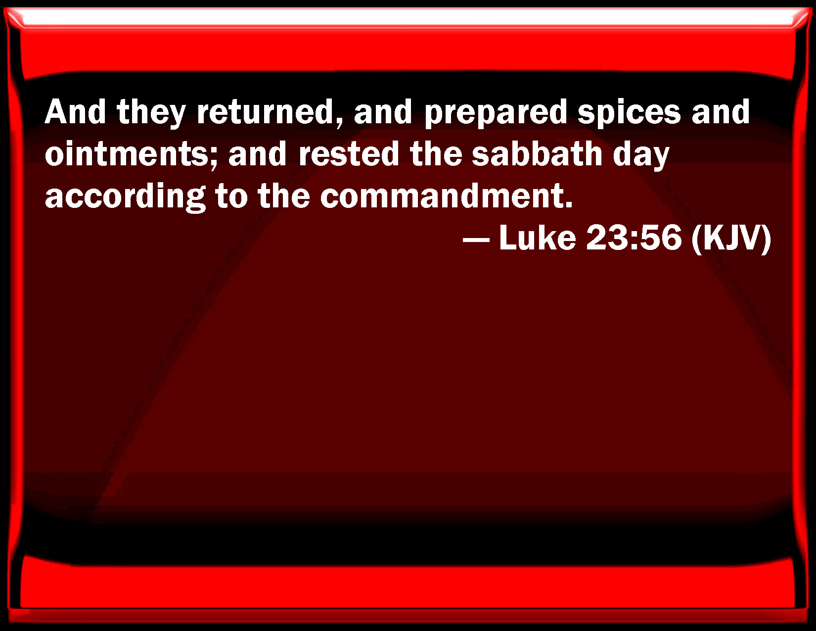 Bible Verse Slide Luke 23:56 And they returned, and prepared spices and ointments; and rested the sabbath day according to the commandment. KJV: And they returned, and prepared spices and ointments; and rested the sabbath day according to the commandment. DRB: And returning, they prepared spices and ointments; and on the sabbath day they rested, according to the commandment. DBT: And having returned they prepared aromatic spices and ointments, and remained quiet on the sabbath, according to the commandment. ERV: And they returned, and prepared spices and ointments. And on the sabbath they rested according to the commandment. WBT: And they returned, and prepared spices and ointments; and rested on the sabbath, according to the commandment. WEB: They returned, and prepared spices and ointments. On the Sabbath they rested according to the commandment. YLT: and having turned back, they made ready spices and ointments, and on the sabbath, indeed, they rested, according to the command.Links Luke 23:56 NIV • Luke 23:56 NLT • Luke 23:56 ESV • Luke 23:56 NASB • Luke 23:56 KJV • Luke 23:56 Interlinear • Luke 23:56 Commentaries • Luke 23:56 Parallel Texts • Luke 23:56 Bible Apps • Luke 23:56 Parallel • Bible Hub |