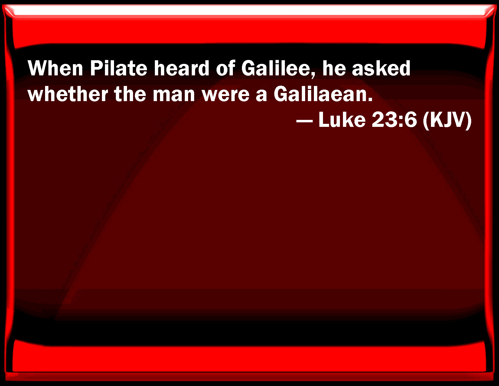 Bible Verse Slide Luke 23:6 When Pilate heard of Galilee, he asked whether the man were a Galilaean. KJV: When Pilate heard of Galilee, he asked whether the man were a Galilaean. DRB: But Pilate hearing Galilee, asked if the man were of Galilee? DBT: But Pilate, having heard Galilee named, demanded if the man were a Galilaean; ERV: But when Pilate heard it, he asked whether the man were a Galilaean. WBT: When Pilate heard of Galilee, he asked whether the man was a Galilean. WEB: But when Pilate heard Galilee mentioned, he asked if the man was a Galilean. YLT: And Pilate having heard of Galilee, questioned if the man is a Galilean,Links Luke 23:6 NIV • Luke 23:6 NLT • Luke 23:6 ESV • Luke 23:6 NASB • Luke 23:6 KJV • Luke 23:6 Interlinear • Luke 23:6 Commentaries • Luke 23:6 Parallel Texts • Luke 23:6 Bible Apps • Luke 23:6 Parallel • Bible Hub |