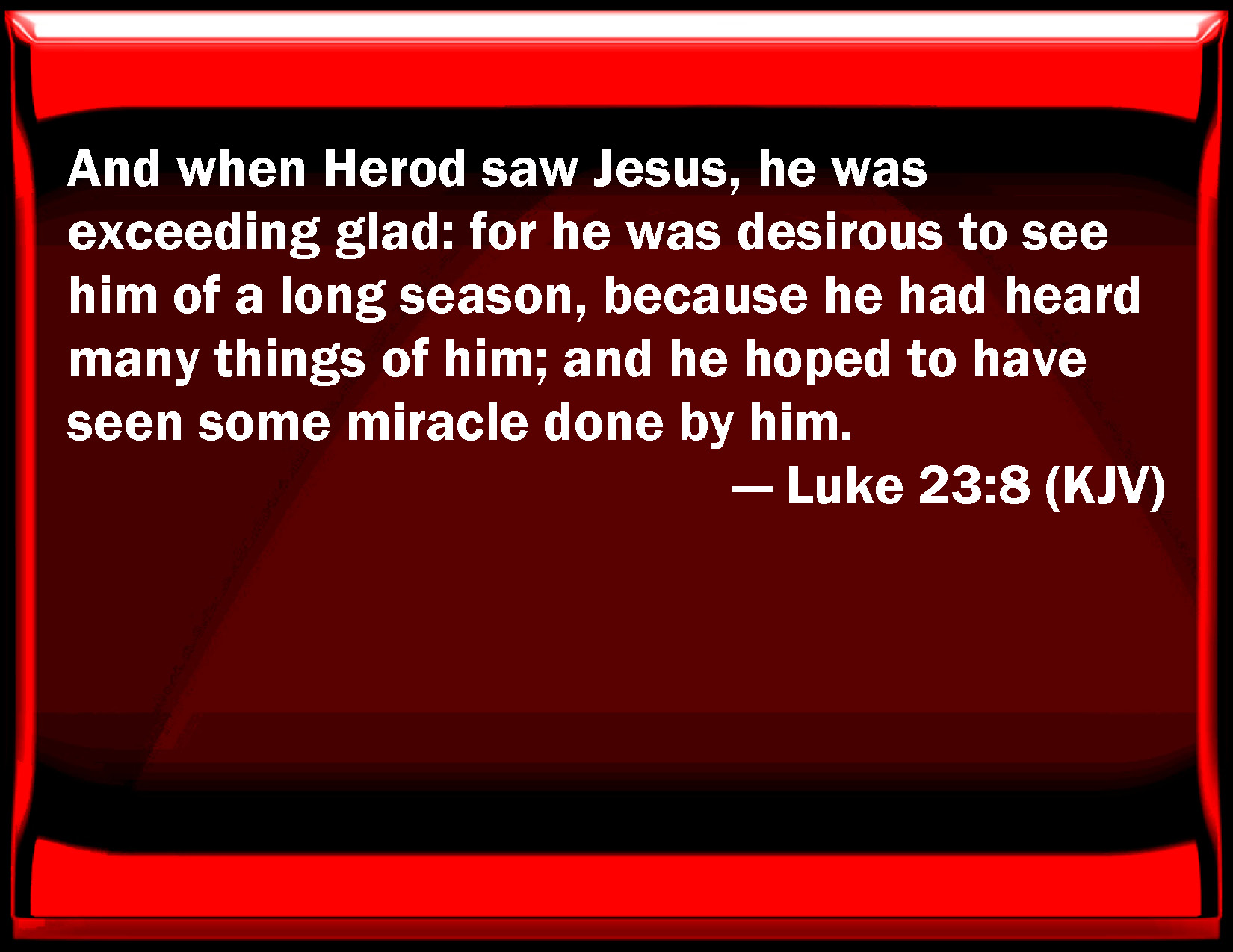 Bible Verse Slide Luke 23:8 And when Herod saw Jesus, he was exceeding glad: for he was desirous to see him of a long season, because he had heard many things of him; and he hoped to have seen some miracle done by him. KJV: And when Herod saw Jesus, he was exceeding glad: for he was desirous to see him of a long season, because he had heard many things of him; and he hoped to have seen some miracle done by him. DRB: And Herod, seeing Jesus, was very glad; for he was desirous of a long time to see him, because he had heard many things of him; and he hoped to see some sign wrought by him. DBT: And when Herod saw Jesus he greatly rejoiced, for he had been a long while desirous of seeing him, because of hearing many things concerning him, and he hoped to see some sign done by him; ERV: Now when Herod saw Jesus, he was exceeding glad: for he was of a long time desirous to see him, because he had heard concerning him; and he hoped to see some miracle done by him. WBT: And when Herod saw Jesus, he was exceeding glad: for he had been for a long time, desirous to see him, because he had heard many things of him; and he hoped to see some miracle done by him. WEB: Now when Herod saw Jesus, he was exceedingly glad, for he had wanted to see him for a long time, because he had heard many things about him. He hoped to see some miracle done by him. YLT: And Herod having seen Jesus did rejoice exceedingly, for he was wishing for a long time to see him, because of hearing many things about him, and he was hoping some sign to see done by him,Links Luke 23:8 NIV • Luke 23:8 NLT • Luke 23:8 ESV • Luke 23:8 NASB • Luke 23:8 KJV • Luke 23:8 Interlinear • Luke 23:8 Commentaries • Luke 23:8 Parallel Texts • Luke 23:8 Bible Apps • Luke 23:8 Parallel • Bible Hub |