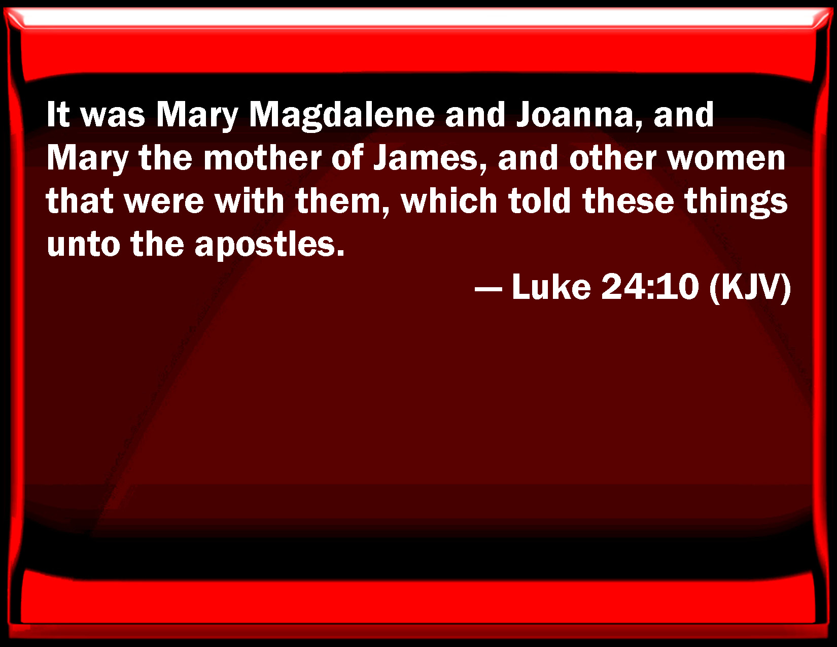 Bible Verse Slide Luke 24:10 It was Mary Magdalene and Joanna, and Mary the mother of James, and other women that were with them, which told these things to the apostles. KJV: It was Mary Magdalene, and Joanna, and Mary the mother of James, and other women that were with them, which told these things unto the apostles. DRB: And it was Mary Magdalen, and Joanna, and Mary of James, and the other women that were with them, who told these things to the apostles. DBT: Now it was Mary of Magdala, and Johanna, and Mary the mother of James, and the others with them, who told these things to the apostles. ERV: Now they were Mary Magdalene, and Joanna, and Mary the mother of James: and the other women with them told these things unto the apostles. WBT: It was Mary Magdalene, and Joanna, and Mary the mother of James, and other women that were with them, who told these things to the apostles. WEB: Now they were Mary Magdalene, Joanna, and Mary the mother of James. The other women with them told these things to the apostles. YLT: And it was the Magdalene Mary, and Joanna, and Mary of James, and the other women with them, who told unto the apostles these things,Links Luke 24:10 NIV • Luke 24:10 NLT • Luke 24:10 ESV • Luke 24:10 NASB • Luke 24:10 KJV • Luke 24:10 Interlinear • Luke 24:10 Commentaries • Luke 24:10 Parallel Texts • Luke 24:10 Bible Apps • Luke 24:10 Parallel • Bible Hub |