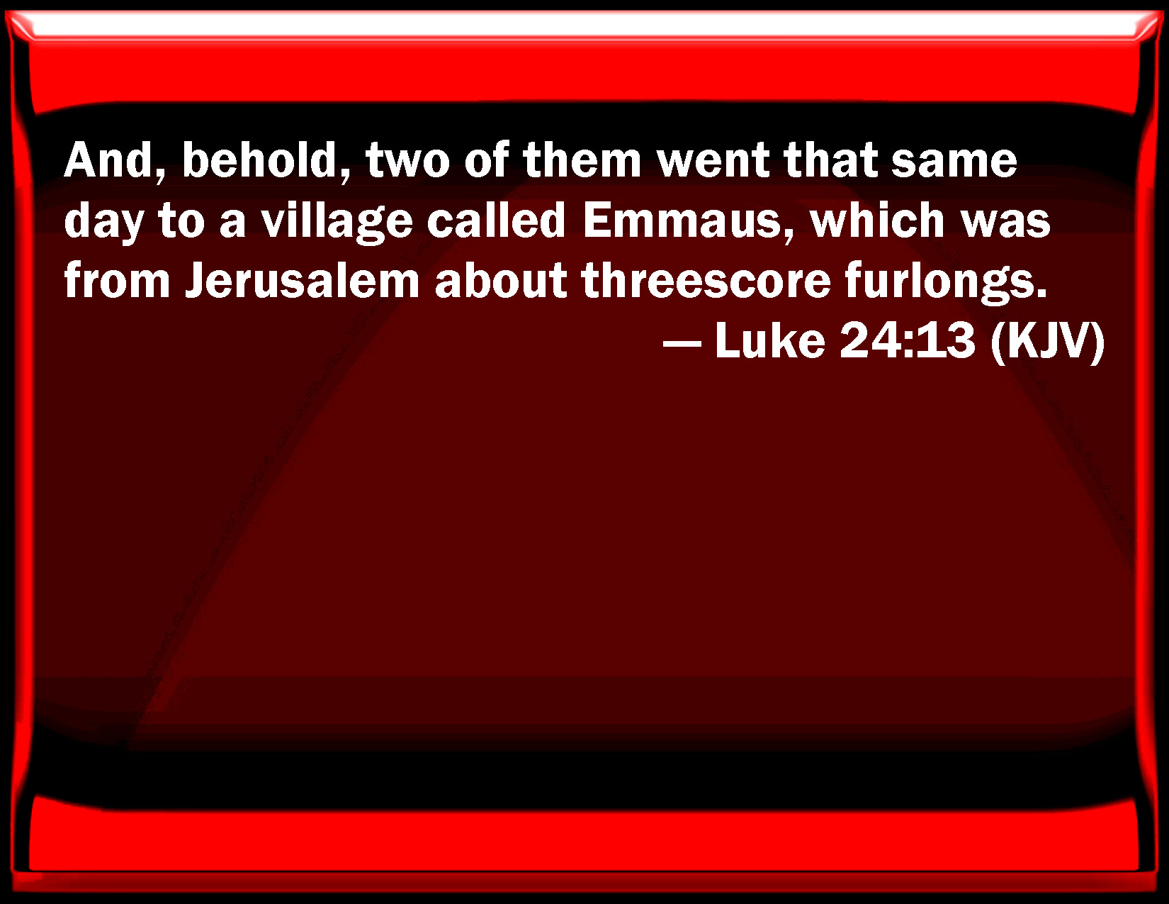 Bible Verse Slide Luke 24:13 And, behold, two of them went that same day to a village called Emmaus, which was from Jerusalem about three score furlongs. KJV: And, behold, two of them went that same day to a village called Emmaus, which was from Jerusalem about threescore furlongs. DRB: And behold, two of them went, the same day, to a town which was sixty furlongs from Jerusalem, named Emmaus. DBT: And behold, two of them were going on the same day to a village distant sixty stadia from Jerusalem, called Emmaus; ERV: And behold, two of them were going that very day to a village named Emmaus, which was threescore furlongs from Jerusalem. WBT: And behold, two of them went that same day to a village called Emmaus, which was from Jerusalem about sixty furlongs. WEB: Behold, two of them were going that very day to a village named Emmaus, which was sixty stadia from Jerusalem. YLT: And, lo, two of them were going on during that day to a village, distant sixty furlongs from Jerusalem, the name of which is Emmaus,Links Luke 24:13 NIV • Luke 24:13 NLT • Luke 24:13 ESV • Luke 24:13 NASB • Luke 24:13 KJV • Luke 24:13 Interlinear • Luke 24:13 Commentaries • Luke 24:13 Parallel Texts • Luke 24:13 Bible Apps • Luke 24:13 Parallel • Bible Hub |
