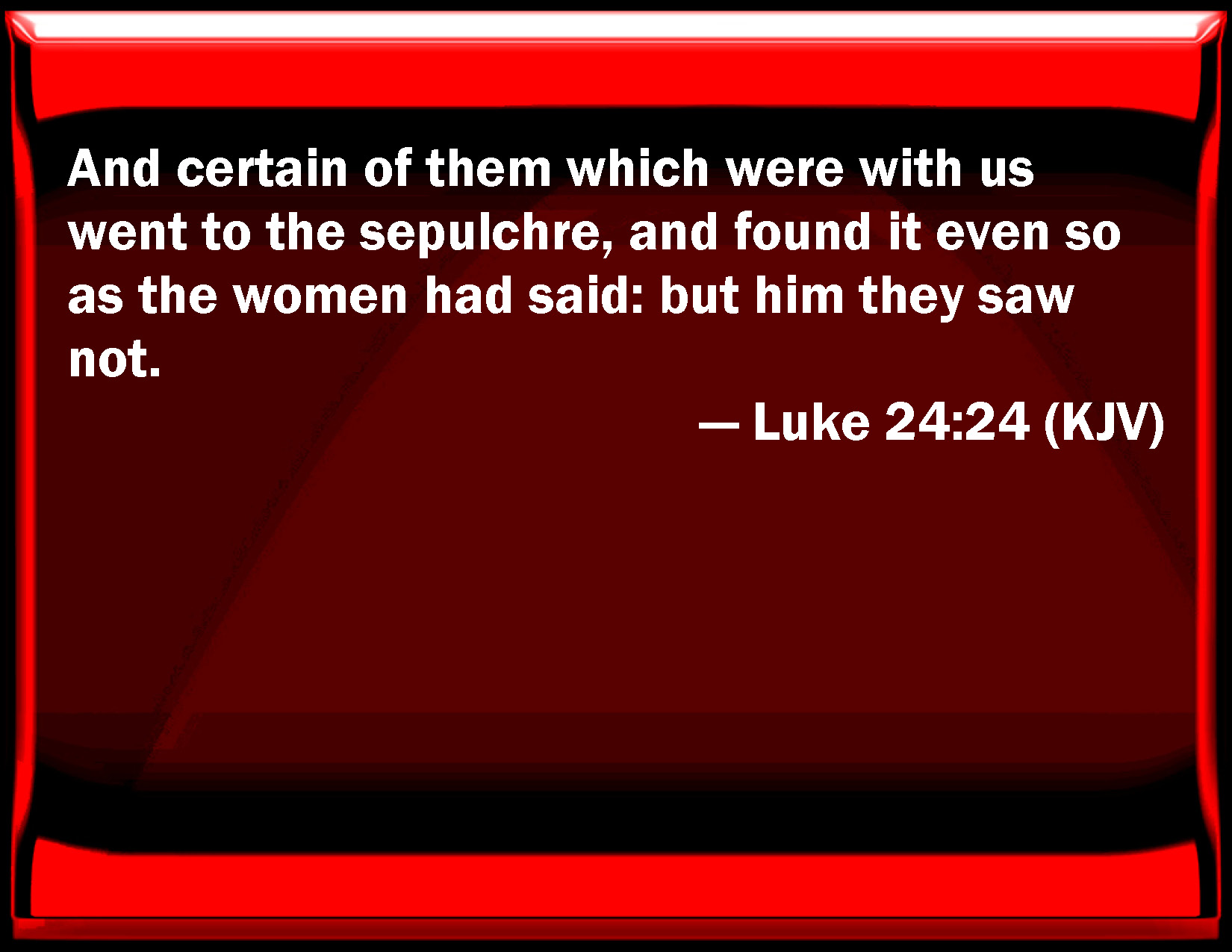 Bible Verse Slide Luke 24:24 And certain of them which were with us went to the sepulcher, and found it even so as the women had said: but him they saw not. KJV: And certain of them which were with us went to the sepulchre, and found it even so as the women had said: but him they saw not. DRB: And some of our people went to the sepulchre, and found it so as the women had said, but him they found not. DBT: And some of those with us went to the sepulchre, and found it so, as the women also had said, but him they saw not. ERV: And certain of them that were with us went to the tomb, and found it even so as the women had said: but him they saw not. WBT: And certain of them who were with us, went to the sepulcher, and found it even so as the women had said: but him they saw not. WEB: Some of us went to the tomb, and found it just like the women had said, but they didn't see him." YLT: and certain of those with us went away unto the tomb, and found as even the women said, and him they saw not.'Links Luke 24:24 NIV • Luke 24:24 NLT • Luke 24:24 ESV • Luke 24:24 NASB • Luke 24:24 KJV • Luke 24:24 Interlinear • Luke 24:24 Commentaries • Luke 24:24 Parallel Texts • Luke 24:24 Bible Apps • Luke 24:24 Parallel • Bible Hub |
