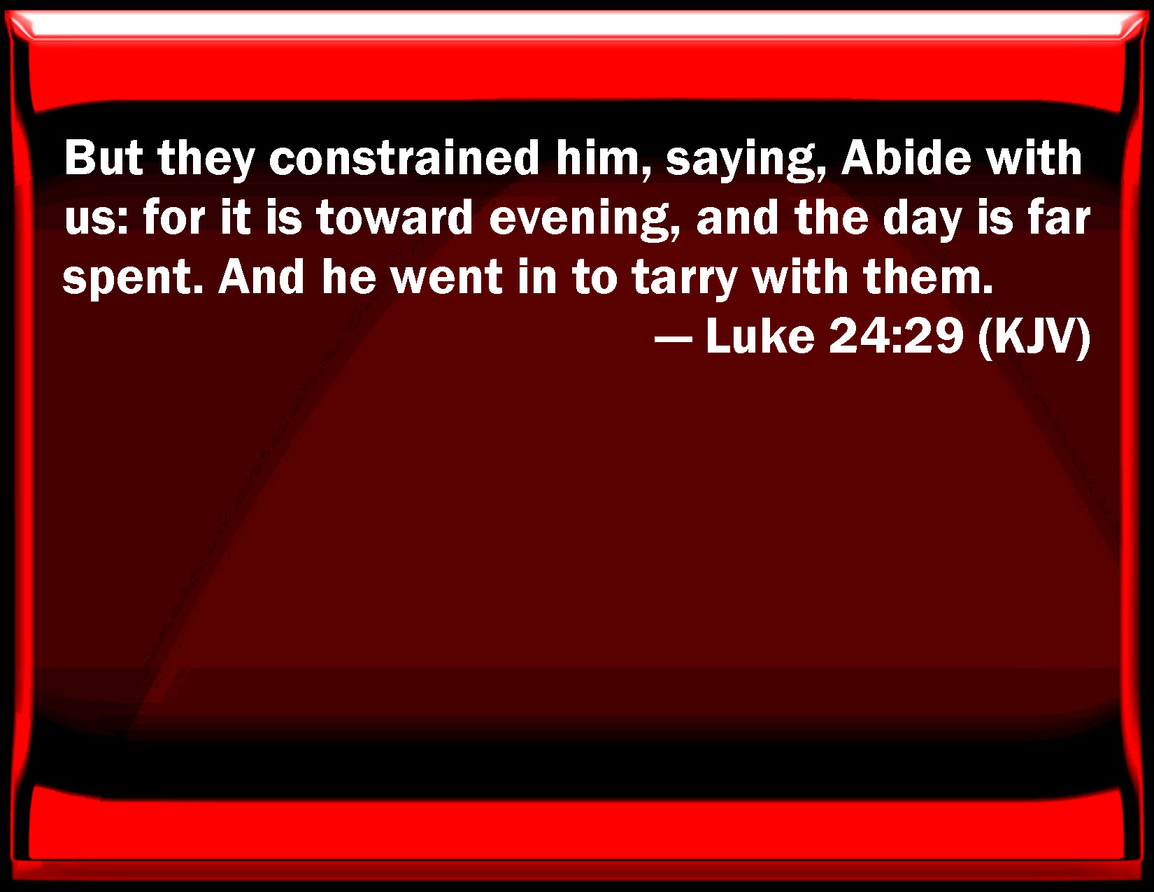 Bible Verse Slide Luke 24:29 But they constrained him, saying, Abide with us: for it is toward evening, and the day is far spent. And he went in to tarry with them. KJV: But they constrained him, saying, Abide with us: for it is toward evening, and the day is far spent. And he went in to tarry with them. DRB: But they constrained him; saying: Stay with us, because it is towards evening, and the day is now far spent. And he went in with them. DBT: And they constrained him, saying, Stay with us, for it is toward evening and the day is declining. And he entered in to stay with them. ERV: And they constrained him, saying, Abide with us: for it is toward evening, and the day is now far spent. And he went in to abide with them. WBT: But they constrained him, saying, Abide with us: for it is towards evening, and the day is far spent. And he went in to tarry with them. WEB: They urged him, saying, "Stay with us, for it is almost evening, and the day is almost over." He went in to stay with them. YLT: and they constrained him, saying, 'Remain with us, for it is toward evening,' and the day did decline, and he went in to remain with them.Links Luke 24:29 NIV • Luke 24:29 NLT • Luke 24:29 ESV • Luke 24:29 NASB • Luke 24:29 KJV • Luke 24:29 Interlinear • Luke 24:29 Commentaries • Luke 24:29 Parallel Texts • Luke 24:29 Bible Apps • Luke 24:29 Parallel • Bible Hub |