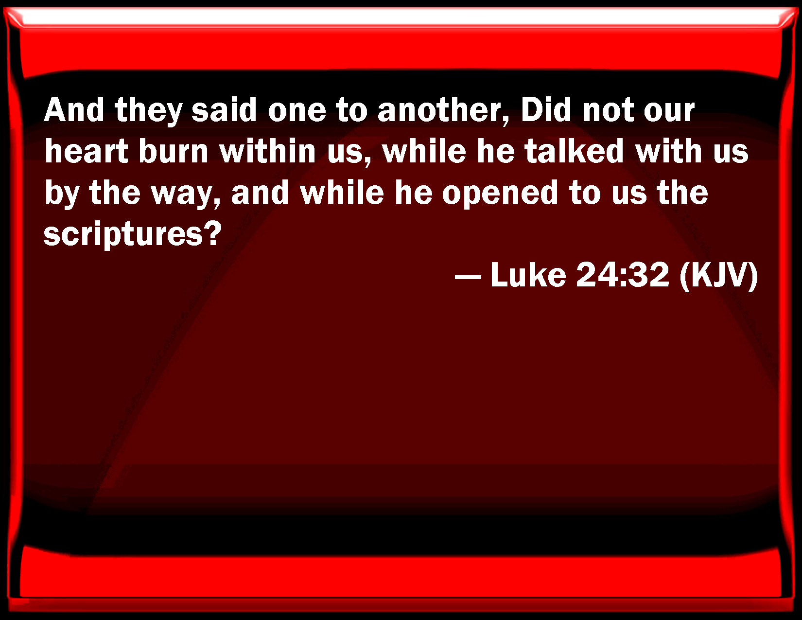 Bible Verse Slide Luke 24:32 And they said one to another, Did not our heart burn within us, while he talked with us by the way, and while he opened to us the scriptures? KJV: And they said one to another, Did not our heart burn within us, while he talked with us by the way, and while he opened to us the scriptures? DRB: And they said one to the other: Was not our heart burning within us, whilst he spoke in this way, and opened to us the scriptures? DBT: And they said to one another, Was not our heart burning in us as he spoke to us on the way, and as he opened the scriptures to us? ERV: And they said one to another, Was not our heart burning within us, while he spake to us in the way, while he opened to us the scriptures? WBT: And they said one to another, Did not our heart burn within us while he talked with us by the way, and while he opened to us the scriptures? WEB: They said one to another, "Weren't our hearts burning within us, while he spoke to us along the way, and while he opened the Scriptures to us?" YLT: And they said one to another, 'Was not our heart burning within us, as he was speaking to us in the way, and as he was opening up to us the Writings?'Links Luke 24:32 NIV • Luke 24:32 NLT • Luke 24:32 ESV • Luke 24:32 NASB • Luke 24:32 KJV • Luke 24:32 Interlinear • Luke 24:32 Commentaries • Luke 24:32 Parallel Texts • Luke 24:32 Bible Apps • Luke 24:32 Parallel • Bible Hub |