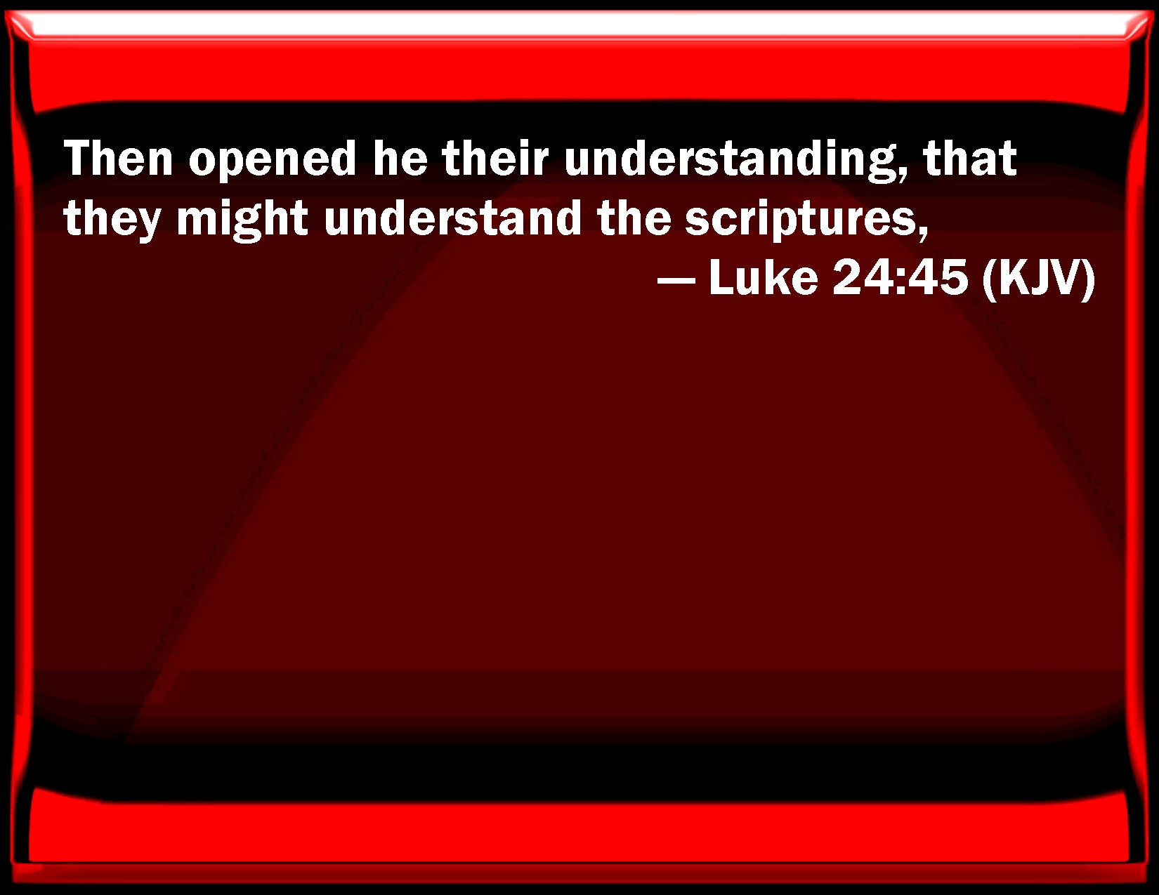 Bible Verse Slide Luke 24:45 Then opened he their understanding, that they might understand the scriptures, KJV: Then opened he their understanding, that they might understand the scriptures, DRB: Then he opened their understanding, that they might understand the scriptures. DBT: Then he opened their understanding to understand the scriptures, ERV: Then opened he their mind, that they might understand the scriptures; WBT: Then he opened their understanding, that they might understand the scriptures, WEB: Then he opened their minds, that they might understand the Scriptures. YLT: Then opened he up their understanding to understand the Writings,Links Luke 24:45 NIV • Luke 24:45 NLT • Luke 24:45 ESV • Luke 24:45 NASB • Luke 24:45 KJV • Luke 24:45 Interlinear • Luke 24:45 Commentaries • Luke 24:45 Parallel Texts • Luke 24:45 Bible Apps • Luke 24:45 Parallel • Bible Hub |