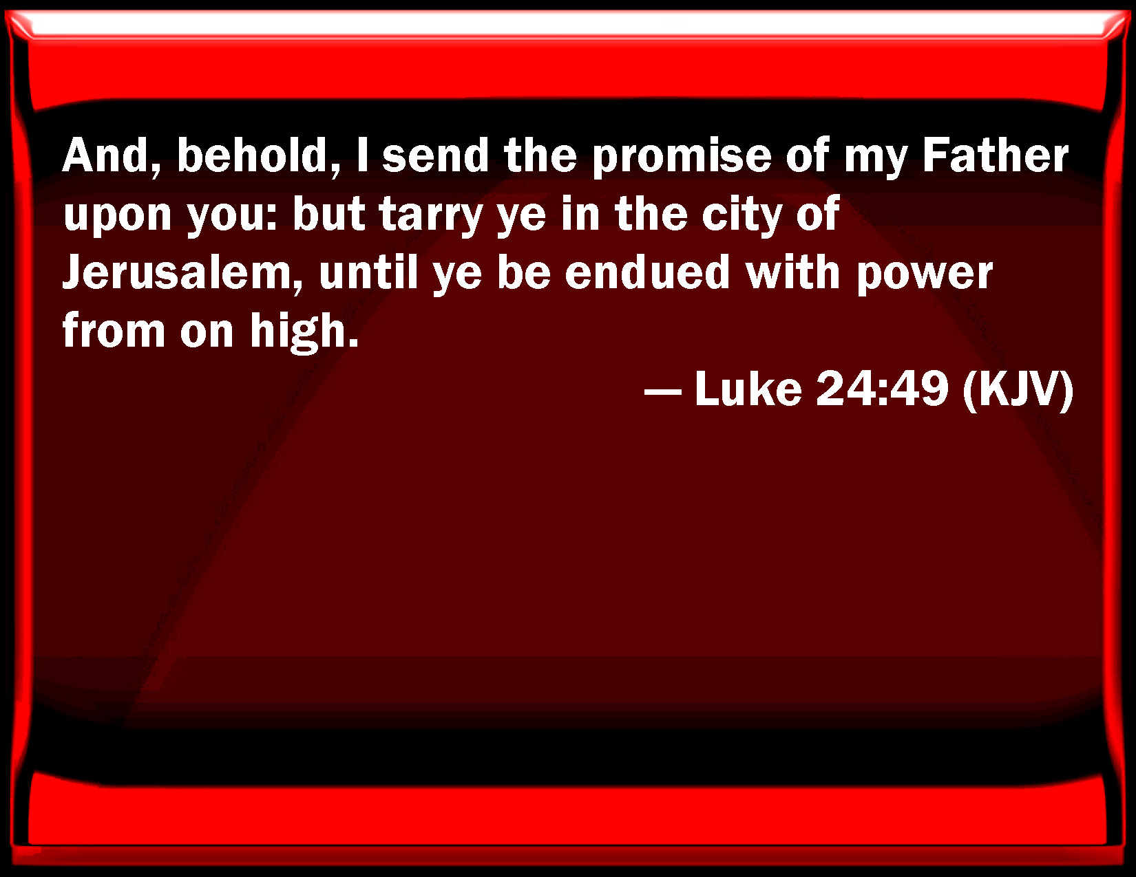 Bible Verse Slide Luke 24:49 And, behold, I send the promise of my Father on you: but tarry you in the city of Jerusalem, until you be endued with power from on high. KJV: And, behold, I send the promise of my Father upon you: but tarry ye in the city of Jerusalem, until ye be endued with power from on high. DRB: And I send the promise of my Father upon you: but stay you in the city till you be endued with power from on high. DBT: And behold, I send the promise of my Father upon you; but do ye remain in the city till ye be clothed with power from on high. ERV: And behold, I send forth the promise of my Father upon you: but tarry ye in the city, until ye be clothed with power from on high. WBT: And behold, I send the promise of my Father upon you: but tarry ye in the city of Jerusalem, until ye are endued with power from on high. WEB: Behold, I send forth the promise of my Father on you. But wait in the city of Jerusalem until you are clothed with power from on high." YLT: And, lo, I do send the promise of my Father upon you, but ye — abide ye in the city of Jerusalem till ye be clothed with power from on high.'Links Luke 24:49 NIV • Luke 24:49 NLT • Luke 24:49 ESV • Luke 24:49 NASB • Luke 24:49 KJV • Luke 24:49 Interlinear • Luke 24:49 Commentaries • Luke 24:49 Parallel Texts • Luke 24:49 Bible Apps • Luke 24:49 Parallel • Bible Hub |