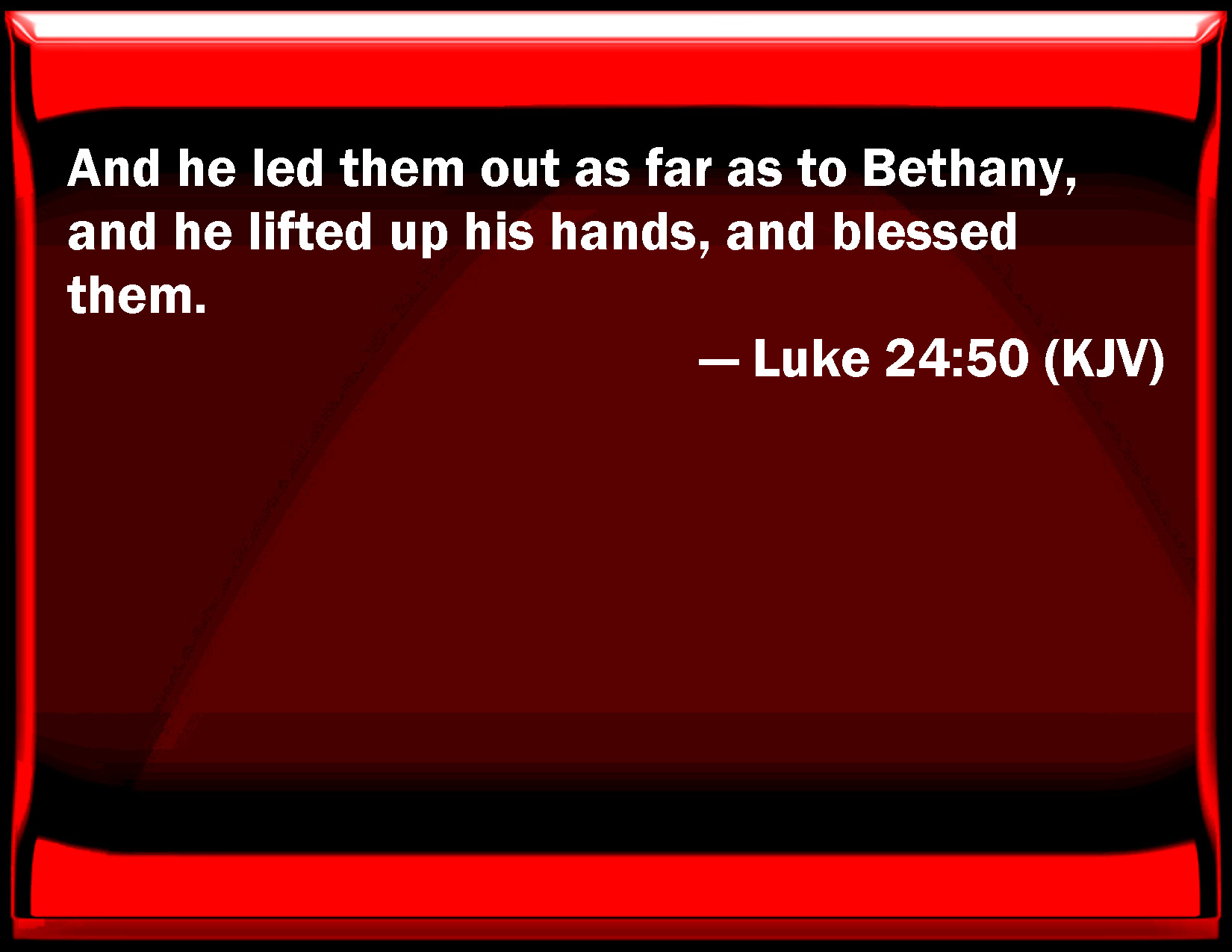 Bible Verse Slide Luke 24:50 And he led them out as far as to Bethany, and he lifted up his hands, and blessed them. KJV: And he led them out as far as to Bethany, and he lifted up his hands, and blessed them. DRB: And he led them out as far as Bethania: and lifting up his hands, he blessed them. DBT: And he led them out as far as Bethany, and having lifted up his hands, he blessed them. ERV: And he led them out until they were over against Bethany: and he lifted up his hands, and blessed them. WBT: And he led them out as far as to Bethany: and he lifted up his hands, and blessed them. WEB: He led them out as far as Bethany, and he lifted up his hands, and blessed them. YLT: And he led them forth without — unto Bethany, and having lifted up his hands he did bless them,Links Luke 24:50 NIV • Luke 24:50 NLT • Luke 24:50 ESV • Luke 24:50 NASB • Luke 24:50 KJV • Luke 24:50 Interlinear • Luke 24:50 Commentaries • Luke 24:50 Parallel Texts • Luke 24:50 Bible Apps • Luke 24:50 Parallel • Bible Hub |