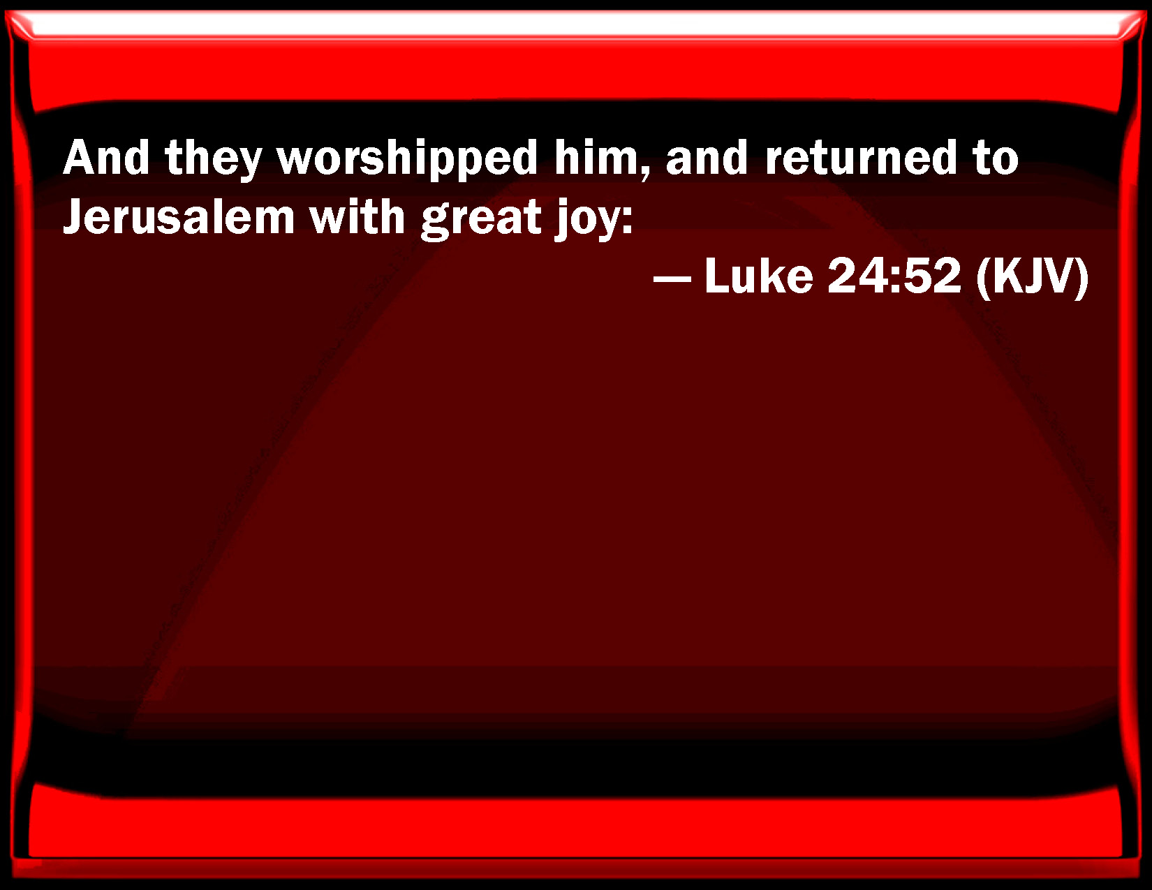 Bible Verse Slide Luke 24:52 And they worshipped him, and returned to Jerusalem with great joy: KJV: And they worshipped him, and returned to Jerusalem with great joy: DRB: And they adoring went back into Jerusalem with great joy. DBT: And they, having done him homage, returned to Jerusalem with great joy, ERV: And they worshipped him, and returned to Jerusalem with great joy: WBT: And they worshiped him, and returned to Jerusalem with great joy: WEB: They worshiped him, and returned to Jerusalem with great joy, YLT: and they, having bowed before him, did turn back to Jerusalem with great joy,Links Luke 24:52 NIV • Luke 24:52 NLT • Luke 24:52 ESV • Luke 24:52 NASB • Luke 24:52 KJV • Luke 24:52 Interlinear • Luke 24:52 Commentaries • Luke 24:52 Parallel Texts • Luke 24:52 Bible Apps • Luke 24:52 Parallel • Bible Hub |