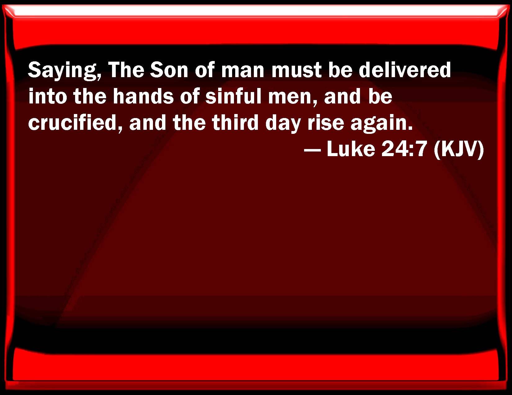 Bible Verse Slide Luke 24:7 Saying, The Son of man must be delivered into the hands of sinful men, and be crucified, and the third day rise again. KJV: Saying, The Son of man must be delivered into the hands of sinful men, and be crucified, and the third day rise again. DRB: Saying: The Son of man must be delivered into the hands of sinful men, and be crucified, and the third day rise again. DBT: saying, The Son of man must be delivered up into the hands of sinners, and be crucified, and rise the third day. ERV: saying that the Son of man must be delivered up into the hands of sinful men, and be crucified, and the third day rise again. WBT: Saying, The Son of man must be delivered into the hands of sinful men, and be crucified, and the third day rise again. WEB: saying that the Son of Man must be delivered up into the hands of sinful men, and be crucified, and the third day rise again?" YLT: saying — It behoveth the Son of Man to be delivered up to the hands of sinful men, and to be crucified, and the third day to rise again.'Links Luke 24:7 NIV • Luke 24:7 NLT • Luke 24:7 ESV • Luke 24:7 NASB • Luke 24:7 KJV • Luke 24:7 Interlinear • Luke 24:7 Commentaries • Luke 24:7 Parallel Texts • Luke 24:7 Bible Apps • Luke 24:7 Parallel • Bible Hub |