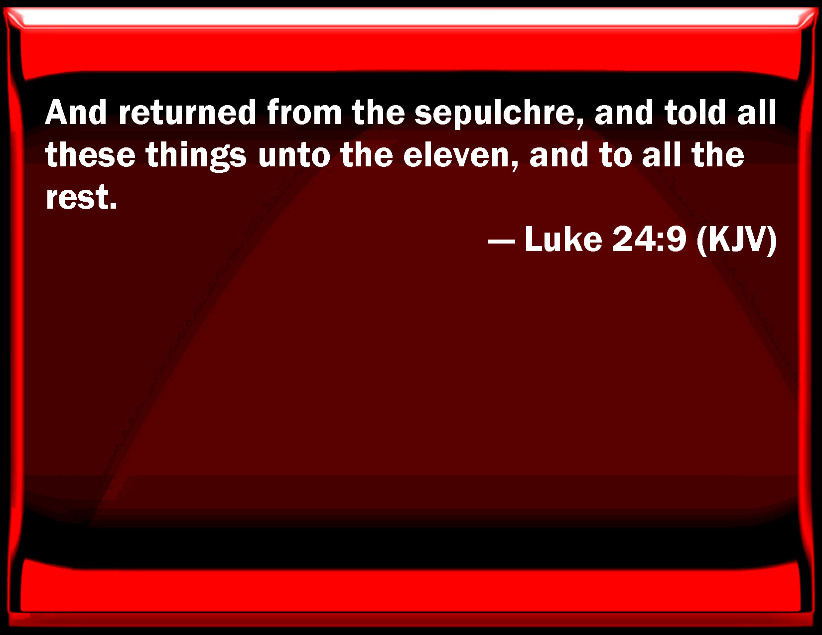 Bible Verse Slide Luke 24:9 And returned from the sepulcher, and told all these things to the eleven, and to all the rest. KJV: And returned from the sepulchre, and told all these things unto the eleven, and to all the rest. DRB: And going back from the sepulchre, they told all these things to the eleven, and to all the rest. DBT: and, returning from the sepulchre, related all these things to the eleven and to all the rest. ERV: and returned from the tomb, and told all these things to the eleven, and to all the rest. WBT: And returned from the sepulcher, and told all these things to the eleven, and to all the rest. WEB: returned from the tomb, and told all these things to the eleven, and to all the rest. YLT: and having turned back from the tomb told all these things to the eleven, and to all the rest.Links Luke 24:9 NIV • Luke 24:9 NLT • Luke 24:9 ESV • Luke 24:9 NASB • Luke 24:9 KJV • Luke 24:9 Interlinear • Luke 24:9 Commentaries • Luke 24:9 Parallel Texts • Luke 24:9 Bible Apps • Luke 24:9 Parallel • Bible Hub |