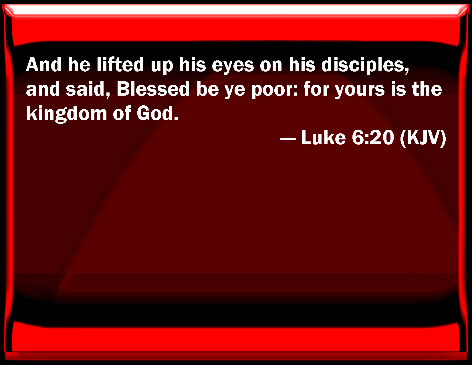 Bible Verse Slide Luke 6:20 And he lifted up his eyes on his disciples, and said, Blessed be you poor: for yours is the kingdom of God. KJV: And he lifted up his eyes on his disciples, and said, Blessed be ye poor: for yours is the kingdom of God. DRB: And he, lifting up his eyes on his disciples, said: Blessed are ye poor, for yours is the kingdom of God. DBT: And he, lifting up his eyes upon his disciples, said, Blessed are ye poor, for yours is the kingdom of God. ERV: And he lifted up his eyes on his disciples, and said, Blessed are ye poor: for yours is the kingdom of God. WBT: And he lifted up his eyes on his disciples, and said, Blessed are ye poor: for yours is the kingdom of God. WEB: He lifted up his eyes to his disciples, and said, "Blessed are you who are poor, for yours is the Kingdom of God. YLT: And he, having lifted up his eyes to his disciples, said: 'Happy the poor — because yours is the reign of God.Links Luke 6:20 NIV • Luke 6:20 NLT • Luke 6:20 ESV • Luke 6:20 NASB • Luke 6:20 KJV • Luke 6:20 Interlinear • Luke 6:20 Commentaries • Luke 6:20 Parallel Texts • Luke 6:20 Bible Apps • Luke 6:20 Parallel • Bible Hub |