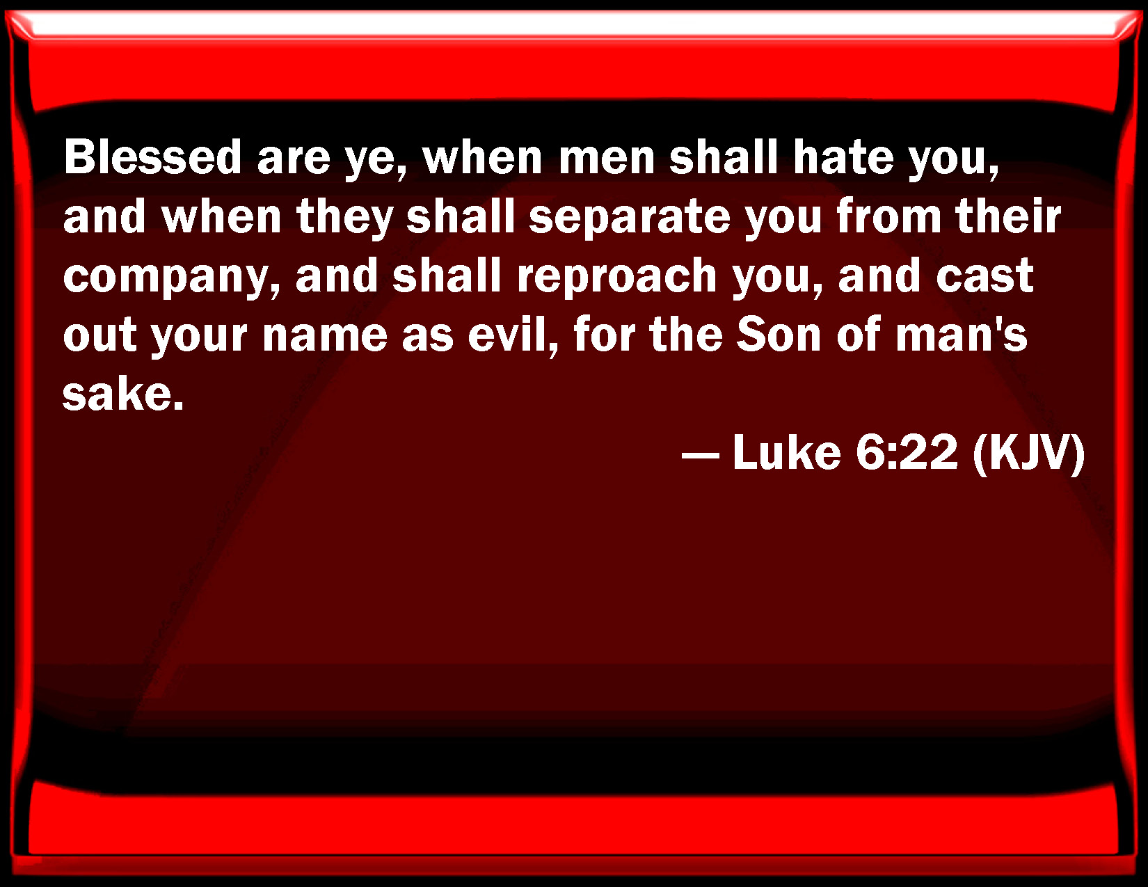 Bible Verse Slide Luke 6:22 Blessed are you, when men shall hate you, and when they shall separate you from their company, and shall reproach you, and cast out your name as evil, for the Son of man's sake. KJV: Blessed are ye, when men shall hate you, and when they shall separate you from their company, and shall reproach you, and cast out your name as evil, for the Son of man's sake. DRB: Blessed shall you be when men shall hate you, and when they shall separate you, and shall reproach you, and cast out your name as evil, for the Son of man's sake. DBT: Blessed are ye when men shall hate you, and when they shall separate you from them, and shall reproach you, and cast out your name as wicked, for the Son of man's sake: ERV: Blessed are ye, when men shall hate you, and when they shall separate you from their company, and reproach you, and cast out your name as evil, for the Son of man's sake. WBT: Blessed are ye when men shall hate you, and when they shall separate you from their company, and shall reproach you, and cast out your name as evil, on account of the son of man. WEB: Blessed are you when men shall hate you, and when they shall exclude and mock you, and throw out your name as evil, for the Son of Man's sake. YLT: Happy are ye when men shall hate you, and when they shall separate you, and shall reproach, and shall cast forth your name as evil, for the Son of Man's sake — Links Luke 6:22 NIV • Luke 6:22 NLT • Luke 6:22 ESV • Luke 6:22 NASB • Luke 6:22 KJV • Luke 6:22 Interlinear • Luke 6:22 Commentaries • Luke 6:22 Parallel Texts • Luke 6:22 Bible Apps • Luke 6:22 Parallel • Bible Hub |