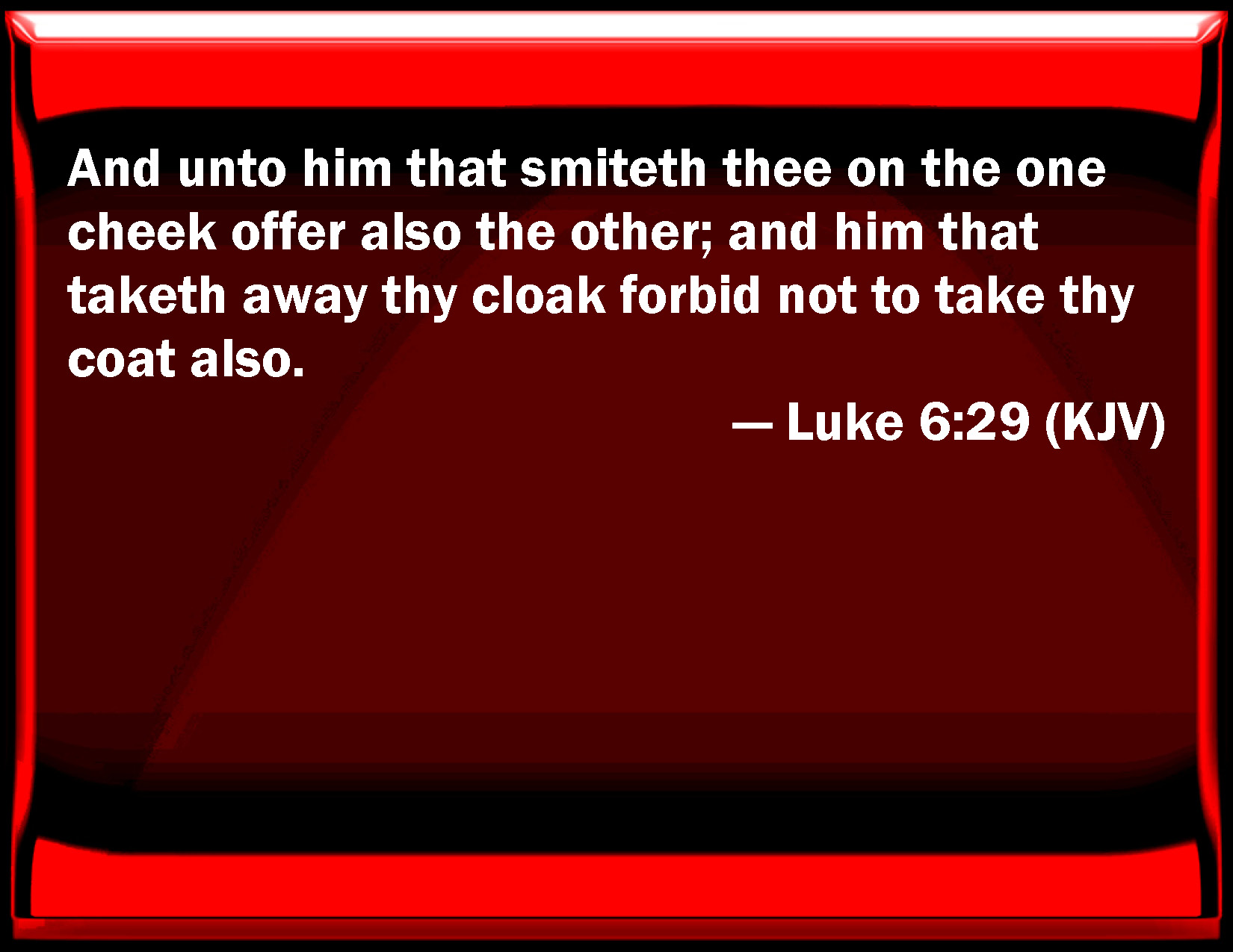 Bible Verse Slide Luke 6:29 And to him that smites you on the one cheek offer also the other; and him that takes away your cloak forbid not to take your coat also. KJV: And unto him that smiteth thee on the one cheek offer also the other; and him that taketh away thy cloke forbid not to take thy coat also. DRB: And to him that striketh thee on the one cheek, offer also the other. And him that taketh away from thee thy cloak, forbid not to take thy coat also. DBT: To him that smites thee on the cheek, offer also the other; and from him that would take away thy garment, forbid not thy body-coat also. ERV: To him that smiteth thee on the one cheek offer also the other; and from him that taketh away thy cloke withhold not thy coat also. WBT: And to him that smiteth thee on the one cheek, offer also the other; and him that taketh away thy cloke, forbid not to take thy coat also. WEB: To him who strikes you on the cheek, offer also the other; and from him who takes away your cloak, don't withhold your coat also. YLT: and to him smiting thee upon the cheek, give also the other, and from him taking away from thee the mantle, also the coat thou mayest not keep back.Links Luke 6:29 NIV • Luke 6:29 NLT • Luke 6:29 ESV • Luke 6:29 NASB • Luke 6:29 KJV • Luke 6:29 Interlinear • Luke 6:29 Commentaries • Luke 6:29 Parallel Texts • Luke 6:29 Bible Apps • Luke 6:29 Parallel • Bible Hub |