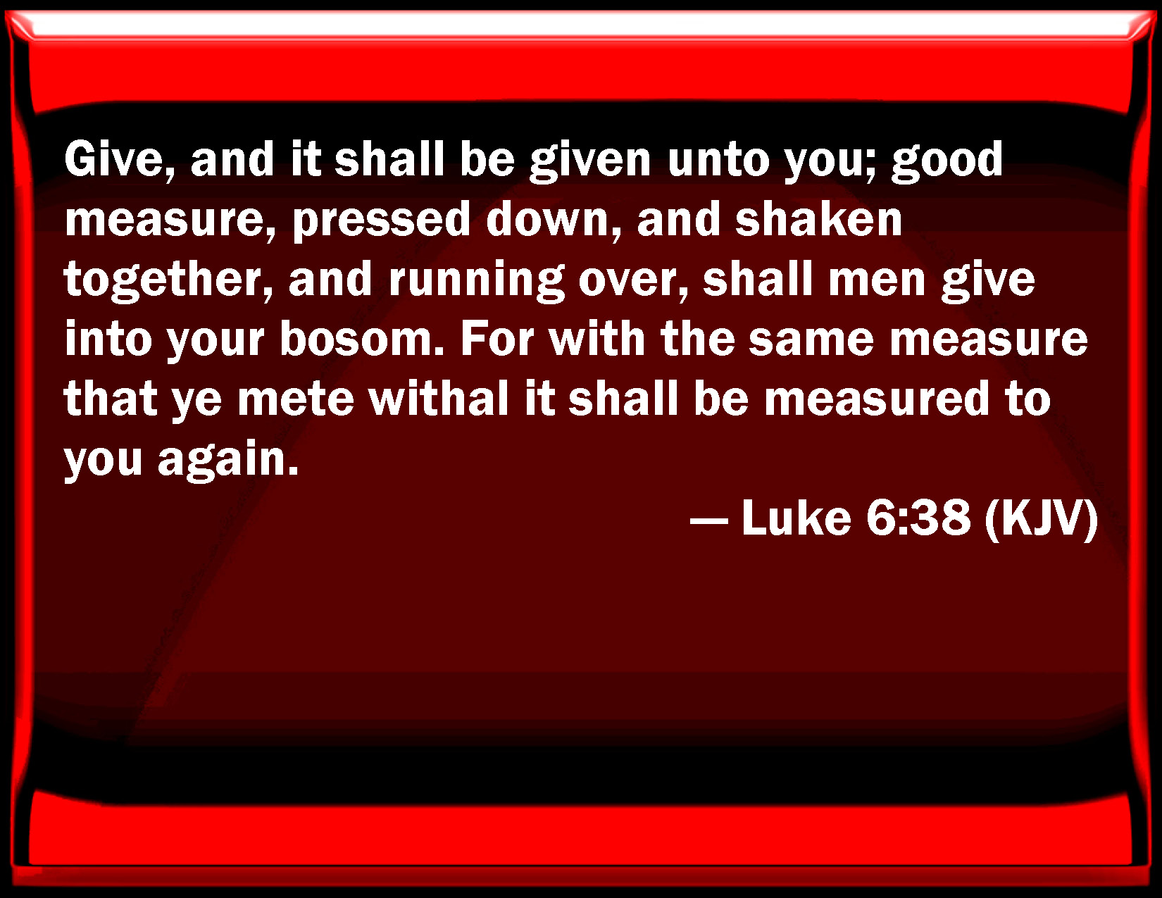 Bible Verse Slide Luke 6:38 Give, and it shall be given to you; good measure, pressed down, and shaken together, and running over, shall men give into your bosom. For with the same measure that you mete with it shall be measured to you again. KJV: Give, and it shall be given unto you; good measure, pressed down, and shaken together, and running over, shall men give into your bosom. For with the same measure that ye mete withal it shall be measured to you again. DRB: Give, and it shall be given to you: good measure and pressed down and shaken together and running over shall they give into your bosom. For with the same measure that you shall mete withal, it shall be measured to you again. DBT: Give, and it shall be given to you; good measure, pressed down, and shaken together, and running over, shall be given into your bosom: for with the same measure with which ye mete it shall be measured to you again. ERV: give, and it shall be given unto you; good measure, pressed down, shaken together, running over, shall they give into your bosom. For with what measure ye mete it shall be measured to you again. WBT: Give, and it shall be given to you; good measure, pressed down, and shaken together, and running over, shall men give into your bosom. For with the same measure that ye give to others, it shall be measured to you again. WEB: "Give, and it will be given to you: good measure, pressed down, shaken together, and running over, will be given to you. For with the same measure you measure it will be measured back to you." YLT: 'Give, and it shall be given to you; good measure, pressed, and shaken, and running over, they shall give into your bosom; for with that measure with which ye measure, it shall be measured to you again.'Links Luke 6:38 NIV • Luke 6:38 NLT • Luke 6:38 ESV • Luke 6:38 NASB • Luke 6:38 KJV • Luke 6:38 Interlinear • Luke 6:38 Commentaries • Luke 6:38 Parallel Texts • Luke 6:38 Bible Apps • Luke 6:38 Parallel • Bible Hub |