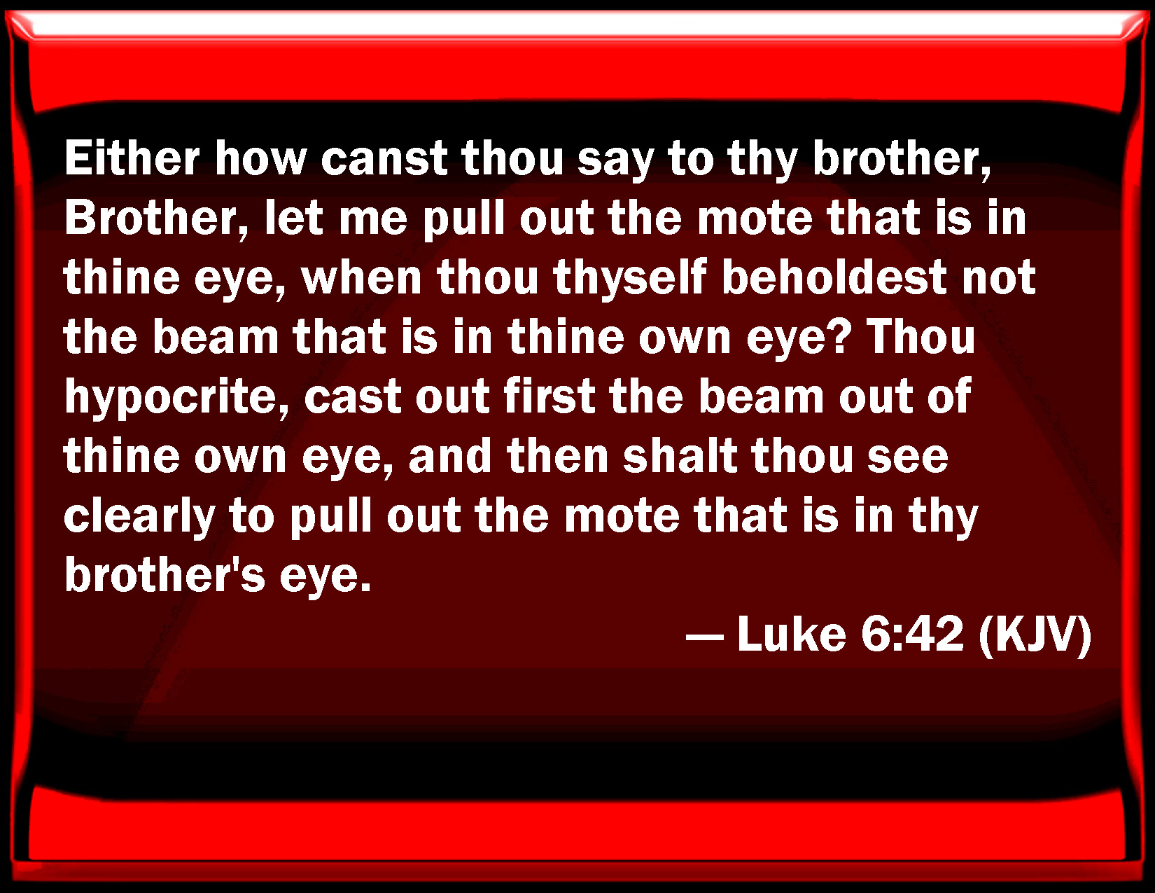 Bible Verse Slide Luke 6:42 Either how can you say to your brother, Brother, let me pull out the mote that is in your eye, when you yourself behold not the beam that is in your own eye? You hypocrite, cast out first the beam out of your own eye, and then shall you see clearly to pull out the mote that is in your brother's eye. KJV: Either how canst thou say to thy brother, Brother, let me pull out the mote that is in thine eye, when thou thyself beholdest not the beam that is in thine own eye? Thou hypocrite, cast out first the beam out of thine own eye, and then shalt thou see clearly to pull out the mote that is in thy brother's eye. DRB: Or how canst thou say to thy brother: Brother, let me pull the mote out of thy eye, when thou thyself seest not the beam in thy own eye? Hypocrite, cast first the beam out of thy own eye; and then shalt thou see clearly to take out the mote from thy brother's eye. DBT: or how canst thou say to thy brother, Brother, allow me, I will cast out the mote that is in thine eye, thyself not seeing the beam that is in thine eye? Hypocrite, cast out first the beam out of thine eye, and then thou shalt see clear to cast out the mote which is in the eye of thy brother. ERV: Or how canst thou say to thy brother, Brother, let me cast out the mote that is in thine eye, when thou thyself beholdest not the beam that is in thine own eye? Thou hypocrite, cast out first the beam out of thine own eye, and then shalt thou see clearly to cast out the mote that is in thy brother's eye. WBT: Either how canst thou say to thy brother, Brother, let me pull out the mote that is in thy eye, when thou thyself beholdest not the beam that is in thy own eye? Thou hypocrite, cast out first the beam out of thy own eye, and then shalt thou see clearly to pull out the mote that is in thy brother's eye. WEB: Or how can you tell your brother, 'Brother, let me remove the speck of chaff that is in your eye,' when you yourself don't see the beam that is in your own eye? You hypocrite! First remove the beam from your own eye, and then you can see clearly to remove the speck of chaff that is in your brother's eye. YLT: or how art thou able to say to thy brother, Brother, suffer, I may take out the mote that is in thine eye — thyself the beam in thine own eye not beholding? Hypocrite, take first the beam out of thine own eye, and then thou shalt see clearly to take out the mote that is in thy brother's eye.Links Luke 6:42 NIV • Luke 6:42 NLT • Luke 6:42 ESV • Luke 6:42 NASB • Luke 6:42 KJV • Luke 6:42 Interlinear • Luke 6:42 Commentaries • Luke 6:42 Parallel Texts • Luke 6:42 Bible Apps • Luke 6:42 Parallel • Bible Hub |