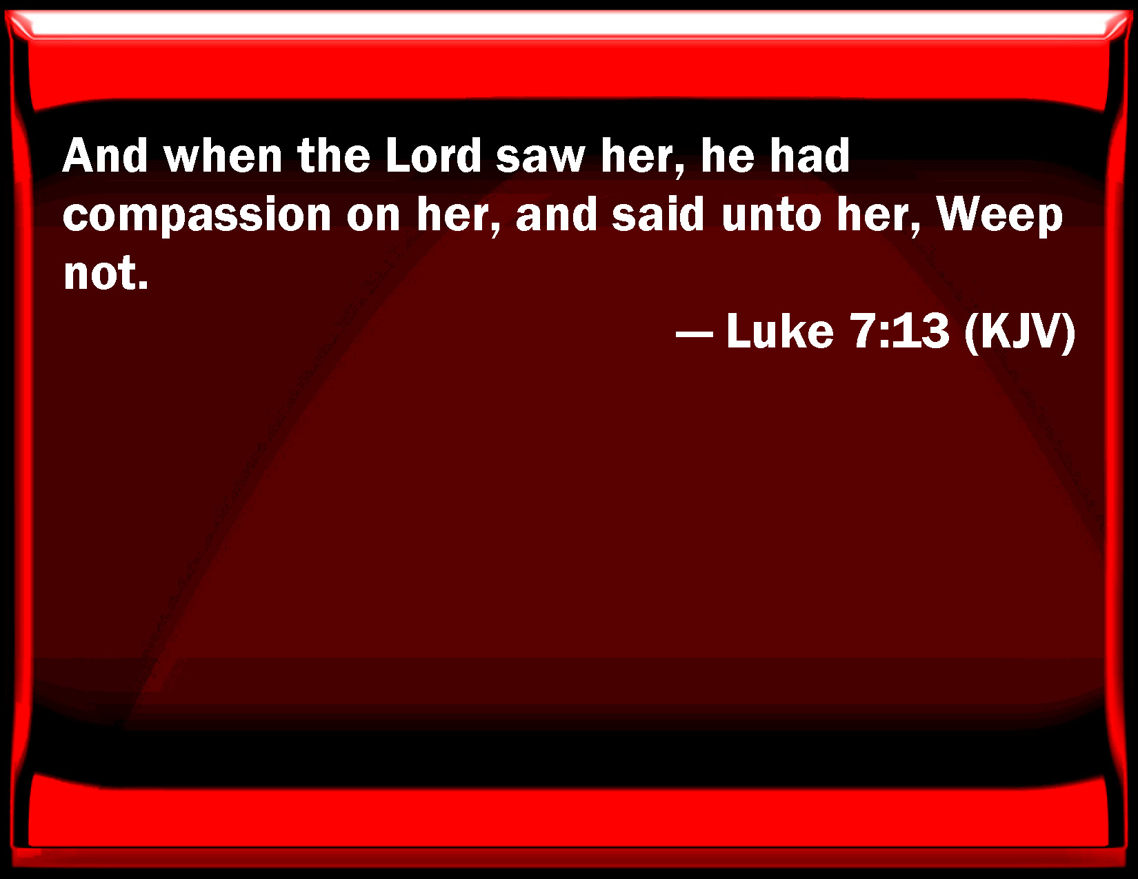 Bible Verse Slide Luke 7:13 And when the Lord saw her, he had compassion on her, and said to her, Weep not. KJV: And when the Lord saw her, he had compassion on her, and said unto her, Weep not. DRB: Whom when the Lord had seen, being moved with mercy towards her, he said to her: Weep not. DBT: And the Lord, seeing her, was moved with compassion for her, and said to her, Weep not; ERV: And when the Lord saw her, he had compassion on her, and said unto her, Weep not. WBT: And when the Lord saw her, he had compassion on her, and said to her, Weep not. WEB: When the Lord saw her, he had compassion on her, and said to her, "Don't cry." YLT: And the Lord having seen her, was moved with compassion towards her, and said to her, 'Be not weeping;'Links Luke 7:13 NIV • Luke 7:13 NLT • Luke 7:13 ESV • Luke 7:13 NASB • Luke 7:13 KJV • Luke 7:13 Interlinear • Luke 7:13 Commentaries • Luke 7:13 Parallel Texts • Luke 7:13 Bible Apps • Luke 7:13 Parallel • Bible Hub |