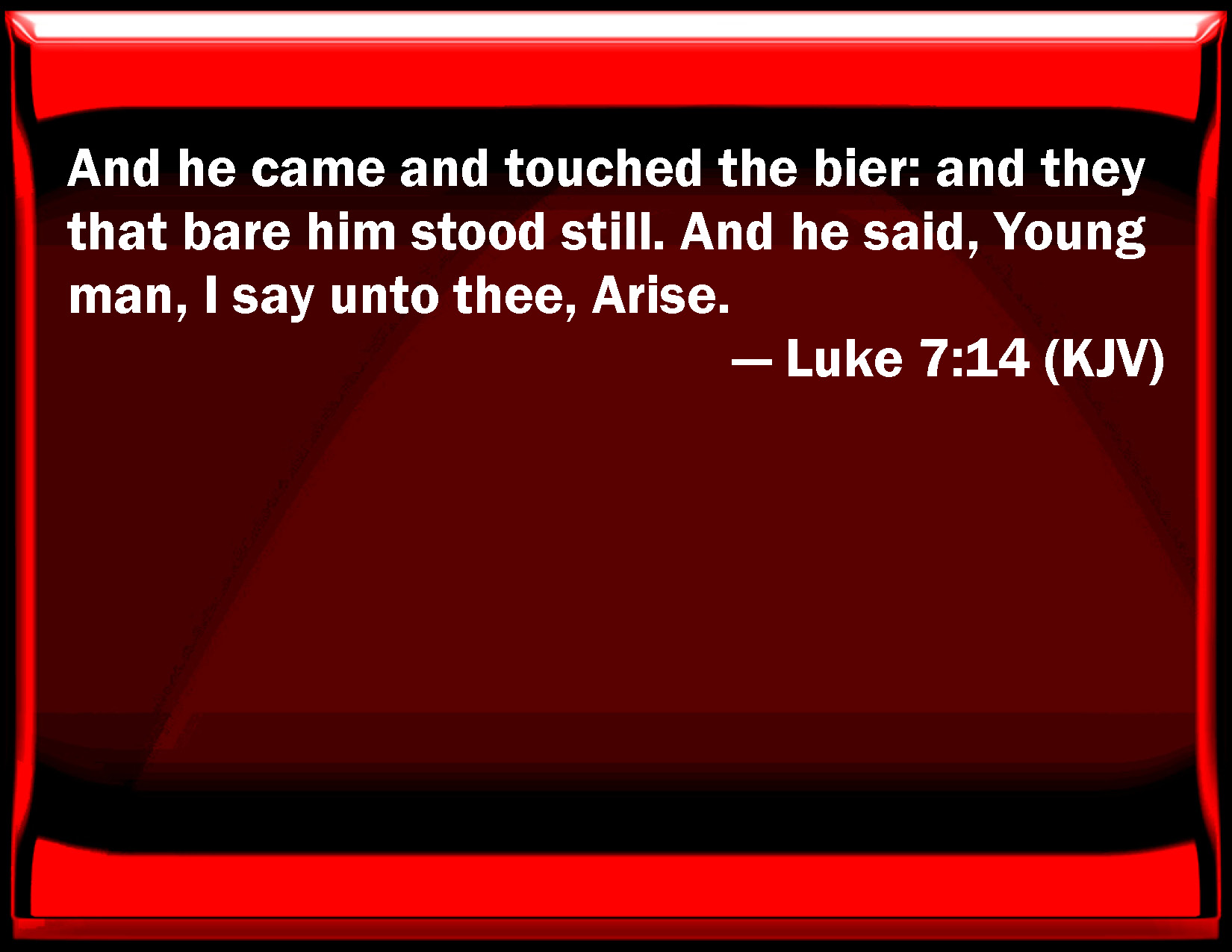 Bible Verse Slide Luke 7:14 And he came and touched the bier: and they that bore him stood still. And he said, Young man, I say to you, Arise. KJV: And he came and touched the bier: and they that bare him stood still. And he said, Young man, I say unto thee, Arise. DRB: And he came near and touched the bier. And they that carried it, stood still. And he said: Young man, I say to thee, arise. DBT: and coming up he touched the bier, and the bearers stopped. And he said, Youth, I say to thee, Wake up. ERV: And he came nigh and touched the bier: and the bearers stood still. And he said, Young man, I say unto thee, Arise. WBT: And he came and touched the bier: And they that bore him stood still. And he said, Young man, I say to thee, Arise. WEB: He came near and touched the coffin, and the bearers stood still. He said, "Young man, I tell you, arise!" YLT: and having come near, he touched the bier, and those bearing it stood still, and he said, 'Young man, to thee I say, Arise;'Links Luke 7:14 NIV • Luke 7:14 NLT • Luke 7:14 ESV • Luke 7:14 NASB • Luke 7:14 KJV • Luke 7:14 Interlinear • Luke 7:14 Commentaries • Luke 7:14 Parallel Texts • Luke 7:14 Bible Apps • Luke 7:14 Parallel • Bible Hub |