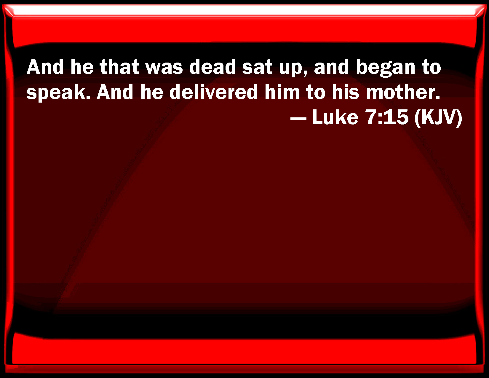 Bible Verse Slide Luke 7:15 And he that was dead sat up, and began to speak. And he delivered him to his mother. KJV: And he that was dead sat up, and began to speak. And he delivered him to his mother. DRB: And he that was dead, sat up, and began to speak. And he gave him to his mother. DBT: And the dead sat up and began to speak; and he gave him to his mother. ERV: And he that was dead sat up, and began to speak. And he gave him to his mother. WBT: And he that was dead sat up, and began to speak, and he delivered him to his mother. WEB: He who was dead sat up, and began to speak. And he gave him to his mother. YLT: and the dead sat up, and began to speak, and he gave him to his mother;Links Luke 7:15 NIV • Luke 7:15 NLT • Luke 7:15 ESV • Luke 7:15 NASB • Luke 7:15 KJV • Luke 7:15 Interlinear • Luke 7:15 Commentaries • Luke 7:15 Parallel Texts • Luke 7:15 Bible Apps • Luke 7:15 Parallel • Bible Hub |