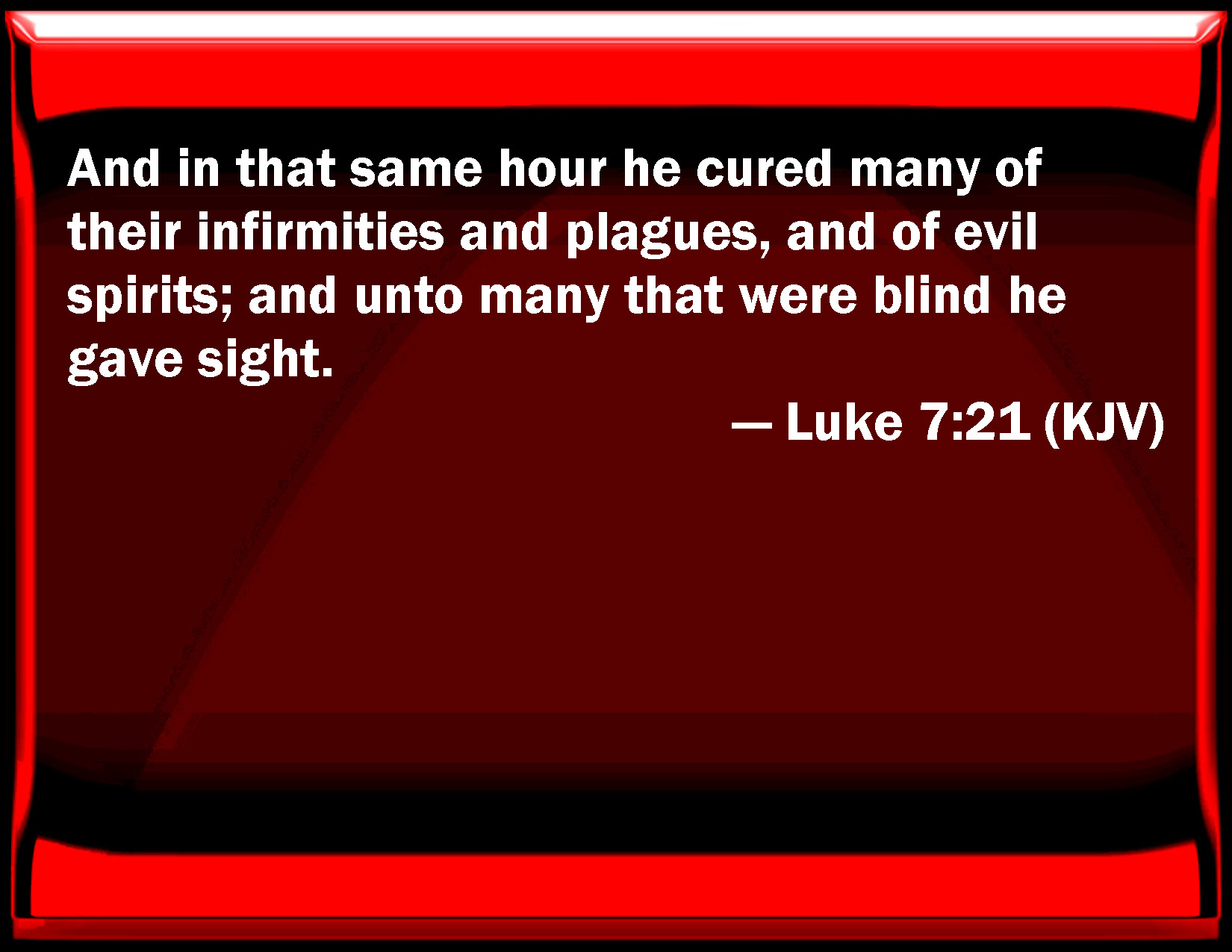 Bible Verse Slide Luke 7:21 And in that same hour he cured many of their infirmities and plagues, and of evil spirits; and to many that were blind he gave sight. KJV: And in that same hour he cured many of their infirmities and plagues, and of evil spirits; and unto many that were blind he gave sight. DRB: (And in that same hour, he cured many of their diseases, and hurts, and evil spirits: and to many that were blind he gave sight.) DBT: In that hour he healed many of diseases and plagues and evil spirits, and to many blind he granted sight. ERV: In that hour he cured many of diseases and plagues and evil spirits; and on many that were blind he bestowed sight. WBT: And in that same hour he cured many of their infirmities, and diseases, and of evil spirits; and to many that were blind he gave sight. WEB: In that hour he cured many of diseases and plagues and evil spirits; and to many who were blind he gave sight. YLT: And in that hour he cured many from sicknesses, and plagues, and evil spirits, and to many blind he granted sight.Links Luke 7:21 NIV • Luke 7:21 NLT • Luke 7:21 ESV • Luke 7:21 NASB • Luke 7:21 KJV • Luke 7:21 Interlinear • Luke 7:21 Commentaries • Luke 7:21 Parallel Texts • Luke 7:21 Bible Apps • Luke 7:21 Parallel • Bible Hub |