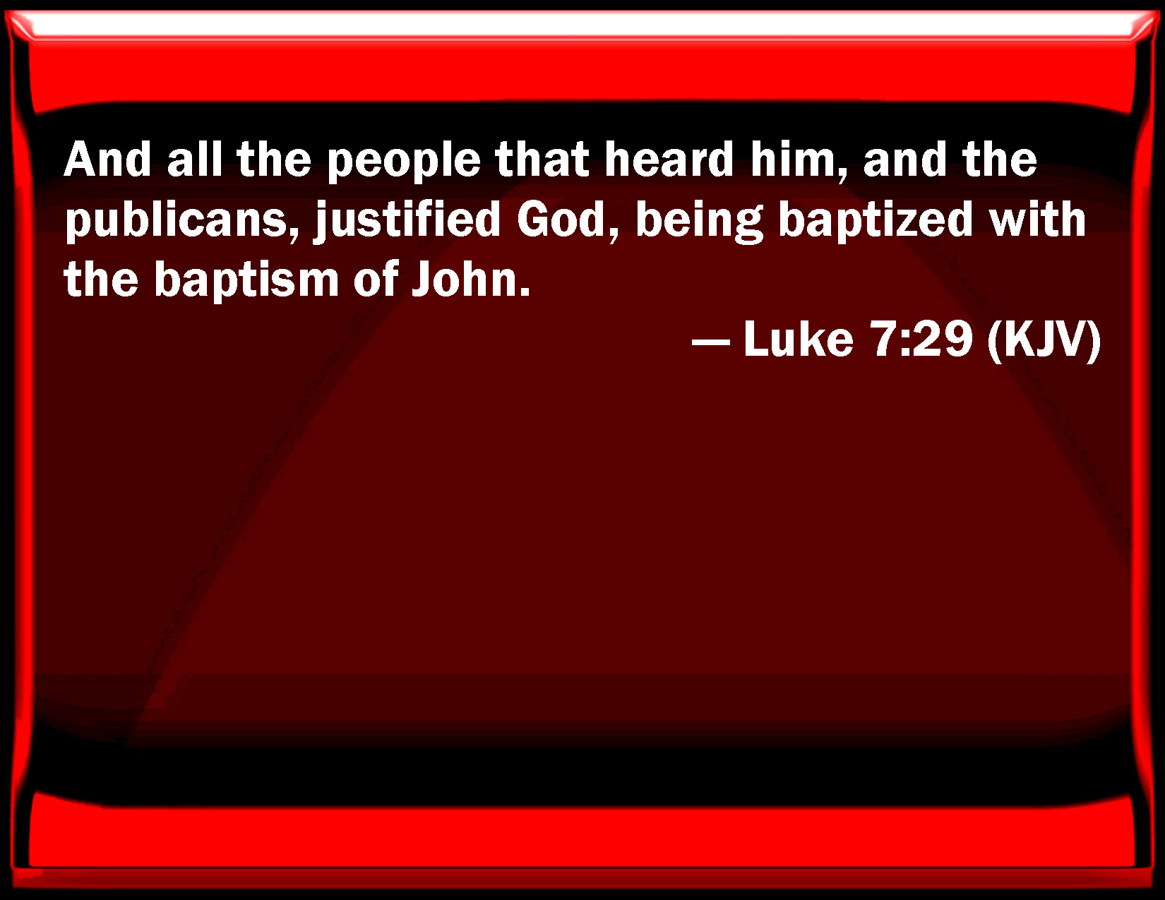 Bible Verse Slide Luke 7:29 And all the people that heard him, and the publicans, justified God, being baptized with the baptism of John. KJV: And all the people that heard him, and the publicans, justified God, being baptized with the baptism of John. DRB: And all the people hearing, and the publicans, justified God, being baptized with John's baptism. DBT: (And all the people who heard it, and the tax-gatherers, justified God, having been baptised with the baptism of John; ERV: And all the people when they heard, and the publicans, justified God, being baptized with the baptism of John. WBT: And all the people that heard him, and the publicans, justified God, being baptized with the baptism of John. WEB: When all the people and the tax collectors heard this, they declared God to be just, having been baptized with John's baptism. YLT: And all the people having heard, and the tax-gatherers, declared God righteous, having been baptized with the baptism of John,Links Luke 7:29 NIV • Luke 7:29 NLT • Luke 7:29 ESV • Luke 7:29 NASB • Luke 7:29 KJV • Luke 7:29 Interlinear • Luke 7:29 Commentaries • Luke 7:29 Parallel Texts • Luke 7:29 Bible Apps • Luke 7:29 Parallel • Bible Hub |