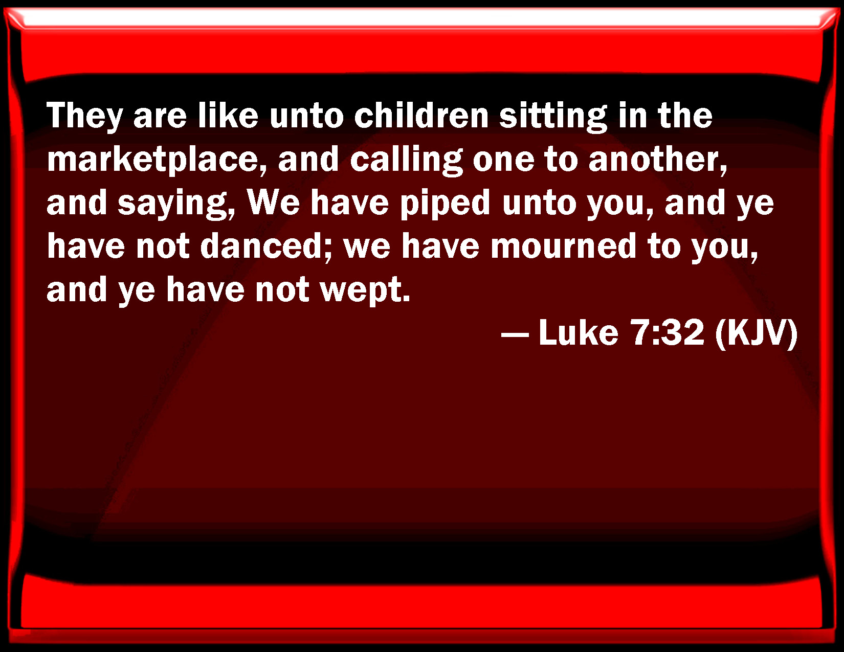 Bible Verse Slide Luke 7:32 They are like to children sitting in the marketplace, and calling one to another, and saying, We have piped to you, and you have not danced; we have mourned to you, and you have not wept. KJV: They are like unto children sitting in the marketplace, and calling one to another, and saying, We have piped unto you, and ye have not danced; we have mourned to you, and ye have not wept. DRB: They are like to children sitting in the marketplace, and speaking one to another, and saying: We have piped to you, and you have not danced: we have mourned, and you have not wept. DBT: They are like children sitting in the market-place, and calling one to another and saying, We have piped to you, and ye have not danced; we have mourned to you, and ye have not wept. ERV: They are like unto children that sit in the marketplace, and call one to another; which say, We piped unto you, and ye did not dance; we wailed, and ye did not weep. WBT: They are like children sitting in the market-place, and calling one to another, and saying, We have piped to you, and ye have not danced; we have mourned to you, and ye have not wept. WEB: They are like children who sit in the marketplace, and call one to another, saying, 'We piped to you, and you didn't dance. We mourned, and you didn't weep.' YLT: they are like to children, to those sitting in a market-place, and calling one to another, and saying, We piped to you, and ye did not dance, we mourned to you, and ye did not weep!Links Luke 7:32 NIV • Luke 7:32 NLT • Luke 7:32 ESV • Luke 7:32 NASB • Luke 7:32 KJV • Luke 7:32 Interlinear • Luke 7:32 Commentaries • Luke 7:32 Parallel Texts • Luke 7:32 Bible Apps • Luke 7:32 Parallel • Bible Hub |