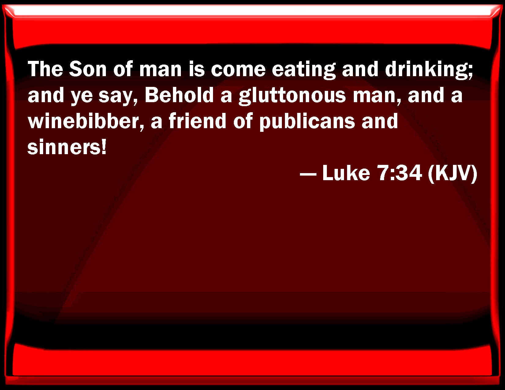 Bible Verse Slide Luke 7:34 The Son of man is come eating and drinking; and you say, Behold a gluttonous man, and a drunkard, a friend of publicans and sinners! KJV: The Son of man is come eating and drinking; and ye say, Behold a gluttonous man, and a winebibber, a friend of publicans and sinners! DRB: The Son of man is come eating and drinking: and you say: Behold a man that is a glutton and a drinker of wine, a friend of publicans and sinners. DBT: The Son of man has come eating and drinking, and ye say, Behold an eater and wine-drinker, a friend of tax-gatherers and sinners; ERV: The Son of man is come eating and drinking; and ye say, Behold, a gluttonous man, and a winebibber, a friend of publicans and sinners! WBT: The Son of man is come eating and drinking; and ye say, Behold, a gluttonous man, and a wine-bibber, a friend of publicans and sinners. WEB: The Son of Man has come eating and drinking, and you say, 'Behold, a gluttonous man, and a drunkard; a friend of tax collectors and sinners!' YLT: the Son of Man came eating and drinking, and ye say, Lo, a man, a glutton, and a wine drinker, a friend of tax-gatherers and sinners;Links Luke 7:34 NIV • Luke 7:34 NLT • Luke 7:34 ESV • Luke 7:34 NASB • Luke 7:34 KJV • Luke 7:34 Interlinear • Luke 7:34 Commentaries • Luke 7:34 Parallel Texts • Luke 7:34 Bible Apps • Luke 7:34 Parallel • Bible Hub |