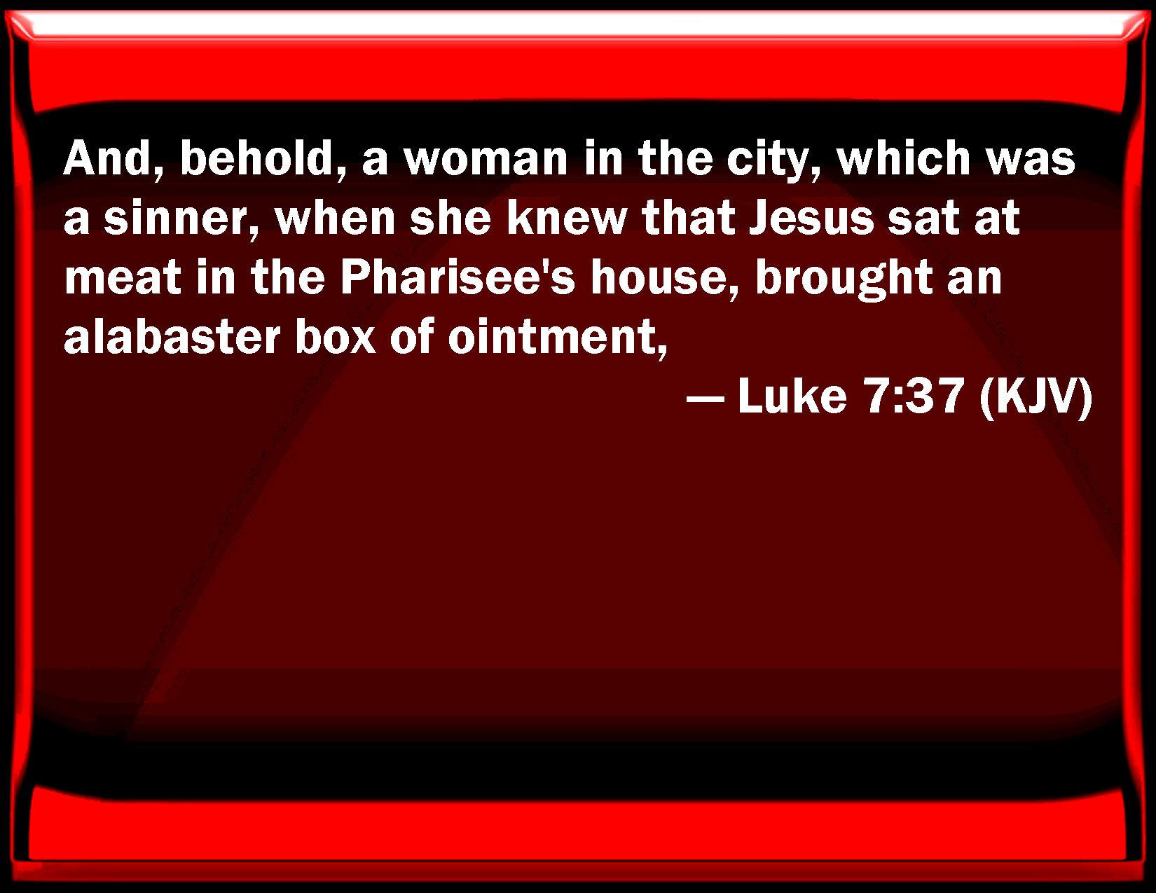 Bible Verse Slide Luke 7:37 And, behold, a woman in the city, which was a sinner, when she knew that Jesus sat at meat in the Pharisee's house, brought an alabaster box of ointment, KJV: And, behold, a woman in the city, which was a sinner, when she knew that Jesus sat at meat in the Pharisee's house, brought an alabaster box of ointment, DRB: And behold a woman that was in the city, a sinner, when she knew that he sat at meat in the Pharisee's house, brought an alabaster box of ointment; DBT: and behold, a woman in the city, who was a sinner, and knew that he was sitting at meat in the house of the Pharisee, having taken an alabaster box of myrrh, ERV: And behold, a woman which was in the city, a sinner; and when she knew that he was sitting at meat in the Pharisee's house, she brought an alabaster cruse of ointment, WBT: And behold, a woman in the city, who was a sinner, when she knew that Jesus sat at table in the Pharisee's house, brought an alabaster-box of ointment, WEB: Behold, a woman in the city who was a sinner, when she knew that he was reclining in the Pharisee's house, she brought an alabaster jar of ointment. YLT: and lo, a woman in the city, who was a sinner, having known that he reclineth (at meat) in the house of the Pharisee, having provided an alabaster box of ointment,Links Luke 7:37 NIV • Luke 7:37 NLT • Luke 7:37 ESV • Luke 7:37 NASB • Luke 7:37 KJV • Luke 7:37 Interlinear • Luke 7:37 Commentaries • Luke 7:37 Parallel Texts • Luke 7:37 Bible Apps • Luke 7:37 Parallel • Bible Hub |